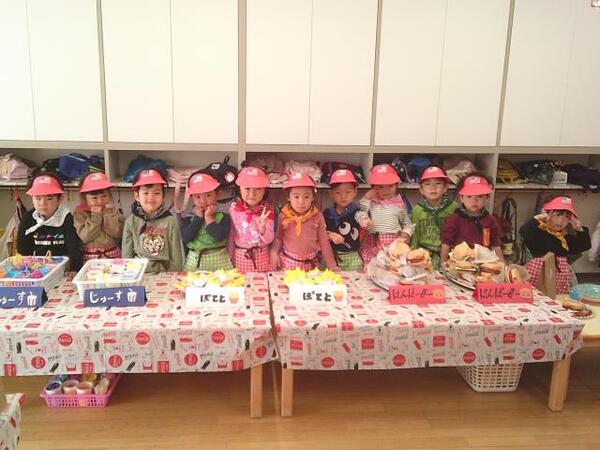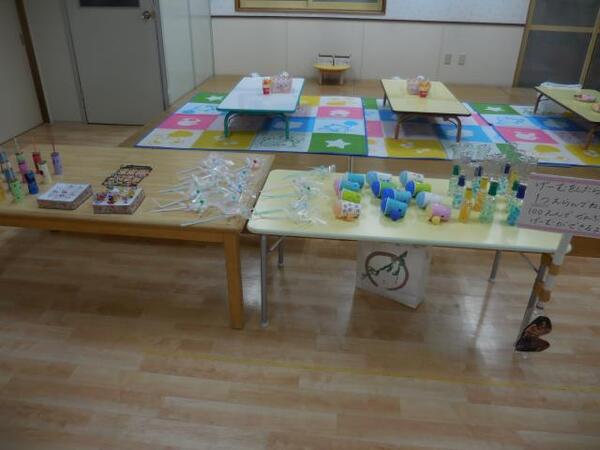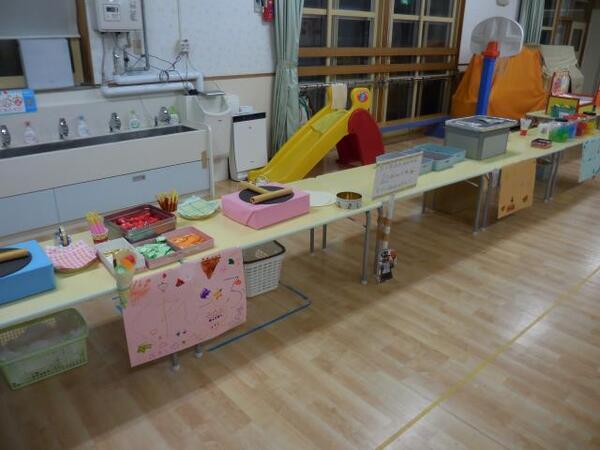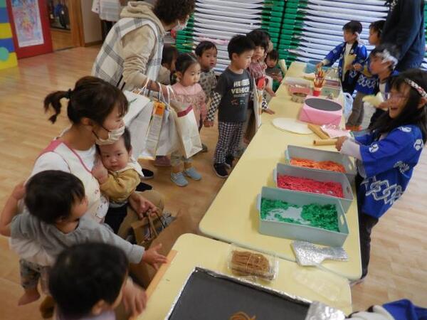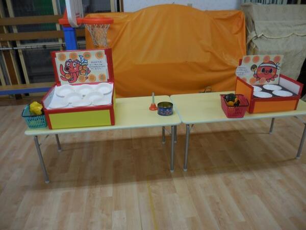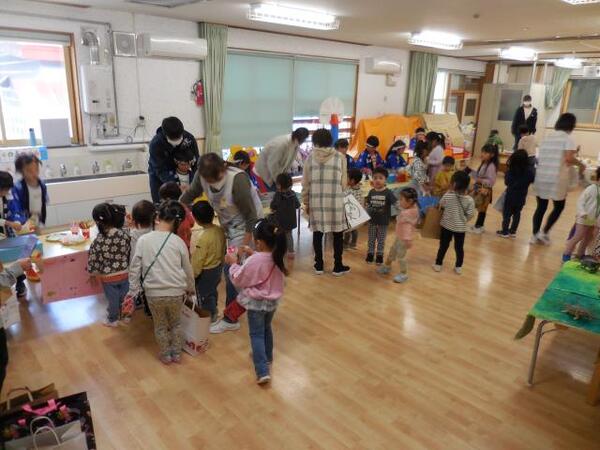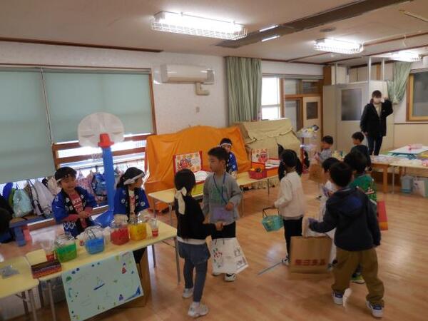 | 10月10日(金) ホールではすみれぐみさんが、『縁日』を開催しています。 どのお店も活気にあふれていて、楽しそうな会話が聞こえてきたり、笑顔が見られましたよ。 今年度のごっこ遊びも大盛況でした。とっても楽しかったね♪ 今後の保育でも取り入れて遊んでいきたいと思います。 |
