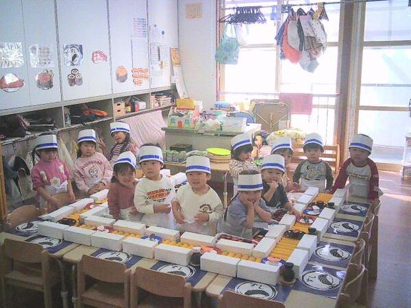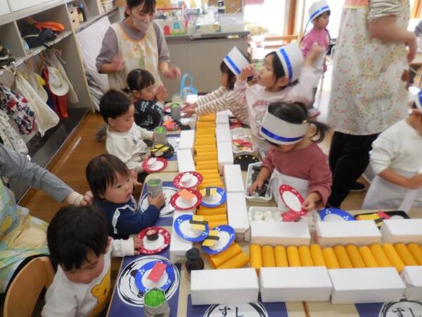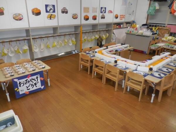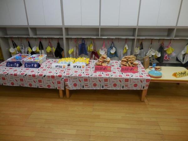 | 10月9日(木) 子ども達が楽しみにしていたごっこ遊びが、今年も始まります。 ここではどんなお店があるのかご紹介! たんぽぽぐみは『お寿司屋さん』。 ちゅうりっぷぐみは『ハンバーガー屋さん』。 すみれぐみのお部屋には『レストラン』をオープンします。 |