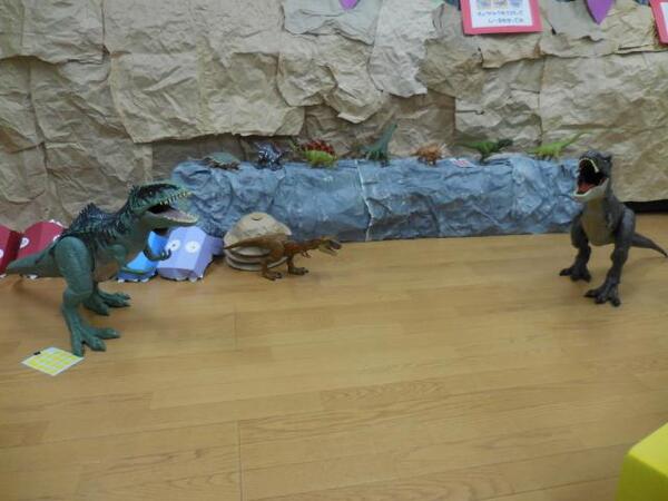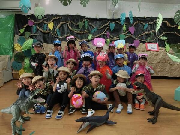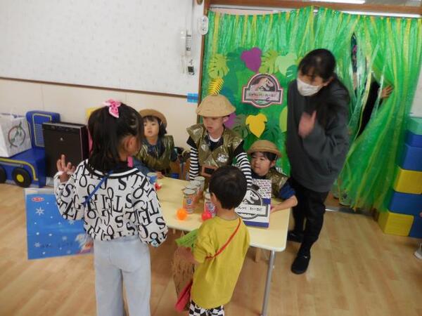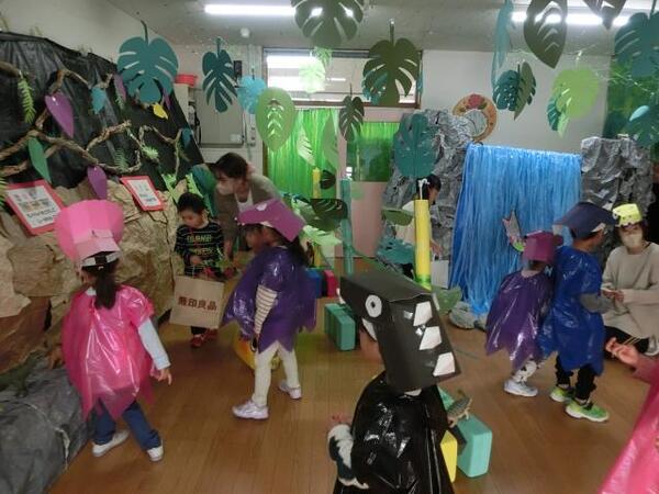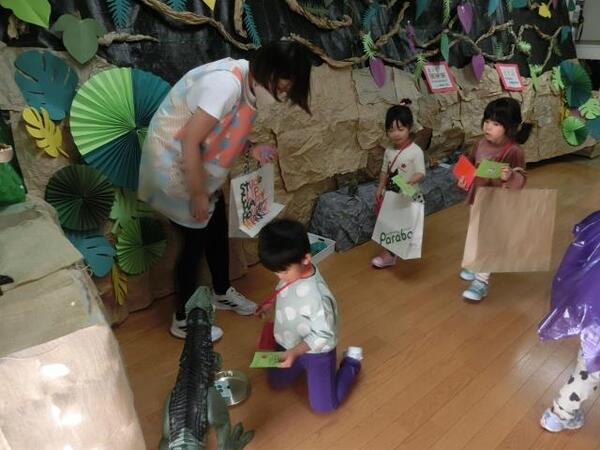 | 10月10日(金) さくらぐみでは『ジュラシックワールド』を開催。 たくさんの恐竜に興味津々の子ども達でした。 優しい恐竜がいっぱいで、小さいお友だちも楽しそうでしたよ。 すみれぐみでは『レストラン』が開店。 美味しそうにお菓子を食べていた子ども達でした。 |