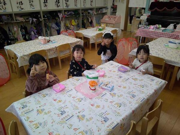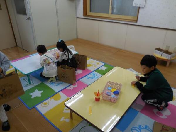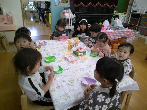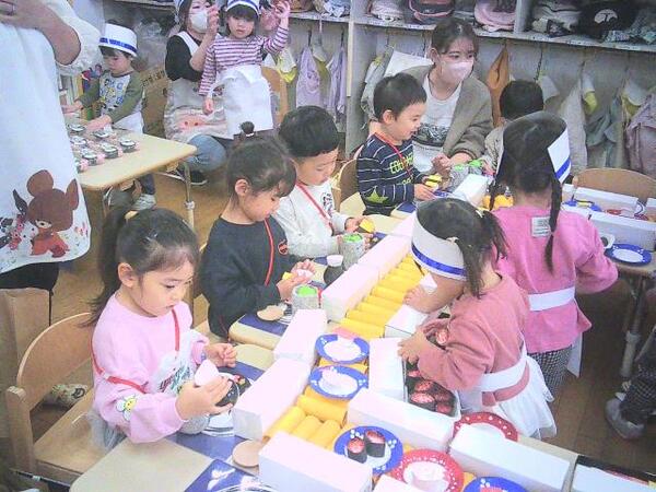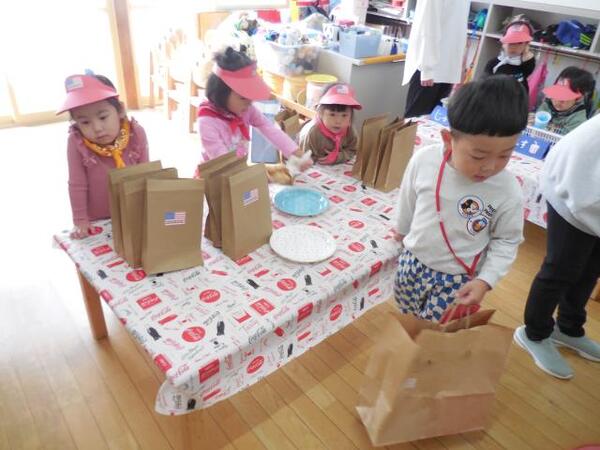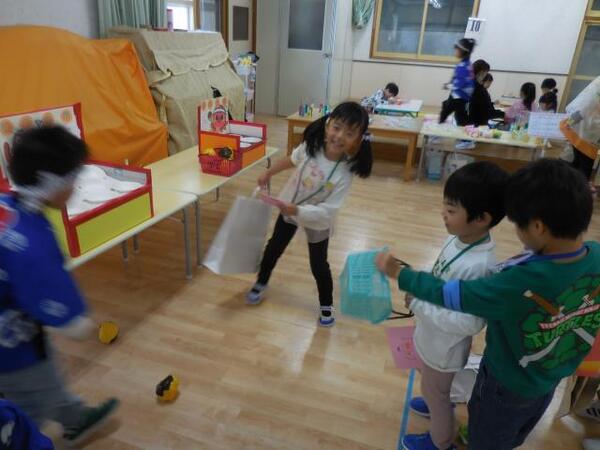 | 10月10日(金) 今日はごっこあそび2日目を行いました。 お店屋さんとお客さんを交代して取り組んでいます。 お店屋さんに扮した子ども達は、笑顔で「いらっしゃいませ〜」と声を出していました。 お客さんは「どこから行く?」とお友だちと相談しながらまわっていました。 たんぽぽぐみでは、『お寿司屋さん』が開店。 お茶を運んでくれたり、お寿司を握ってくれたりと、お寿司屋さんになりきって楽しんでいました。 ちゅうりっぷぐみは、『ハンバーガーやさん』が開店。 笑顔でハンバーガーを渡してくれたり、袋詰めも頑張っていましたよ。 |