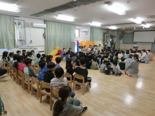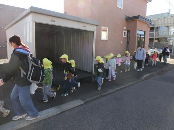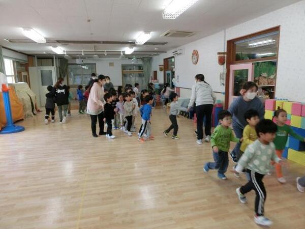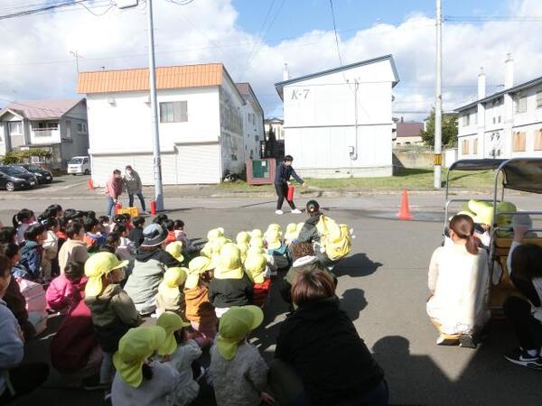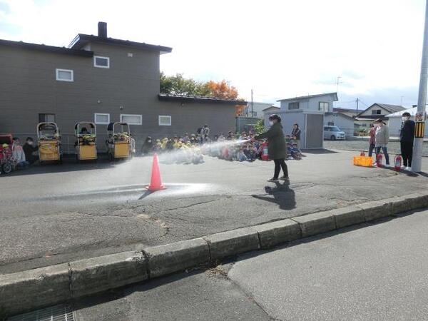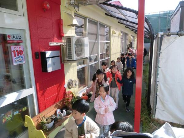 | 10月15日(水) 今日は予告なしでの避難訓練を行ないました。 突然のベルに驚いている様子はありましたが、皆しっかりと先生のお話を聞いて避難することが出来ています。 ジャンパーもすばやく着ることができていましたよ。 先生方の消火訓練を見たり、ホールでDVD『桃太郎の火あそびやめよう!火の用心』なども鑑賞して学びました。 |