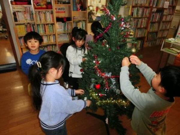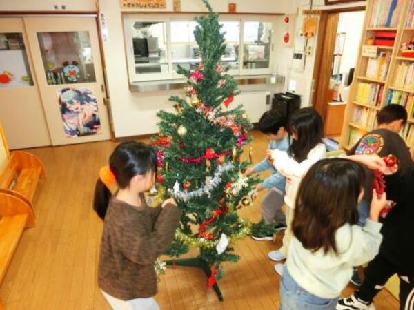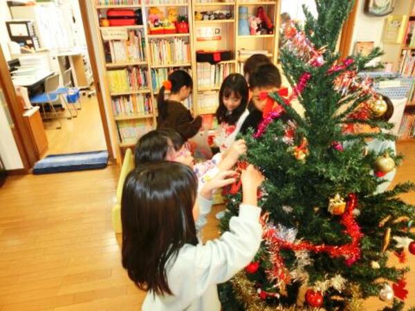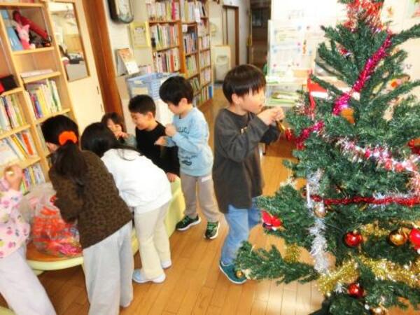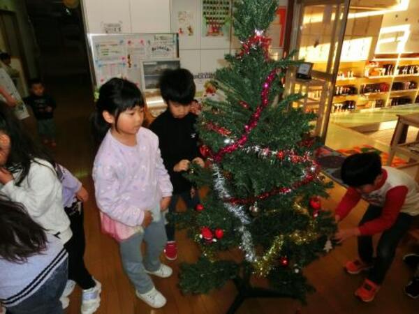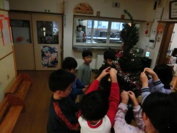 今日のすみれぐみは、午後のおやつの後にクリスマスツリーの飾りつけをしました。