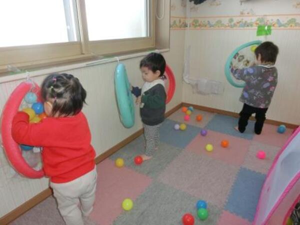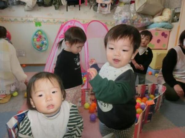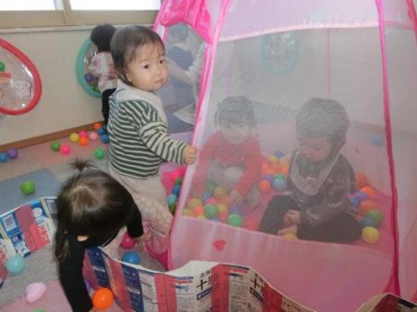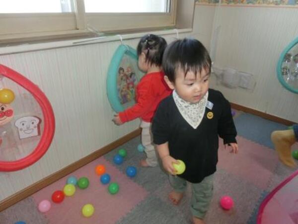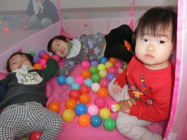今日のひよこぐみは、おゆうぎ会の練習後にお部屋でボールプール・ボールハウスで遊んでいます。