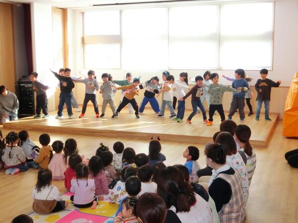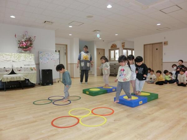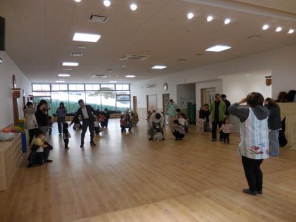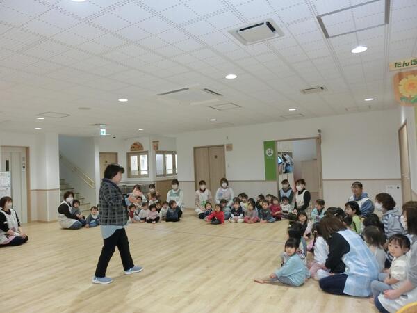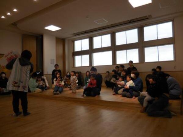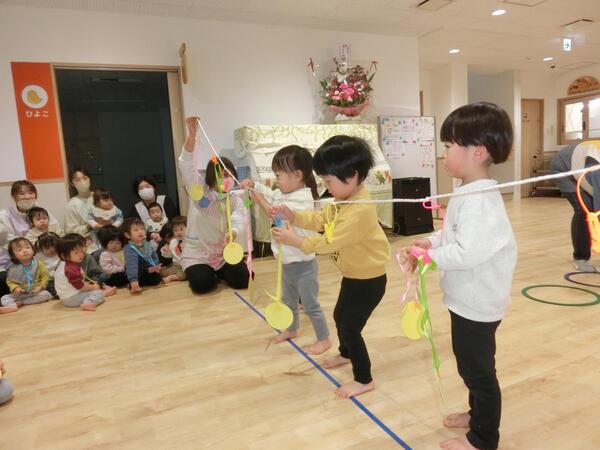 今日のひよこ・つくし・たんぽぽぐみは、1階のホールで新年お楽しみ会を行いました。 |