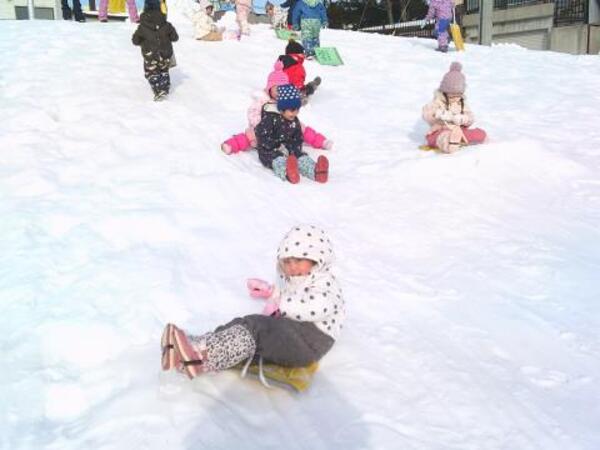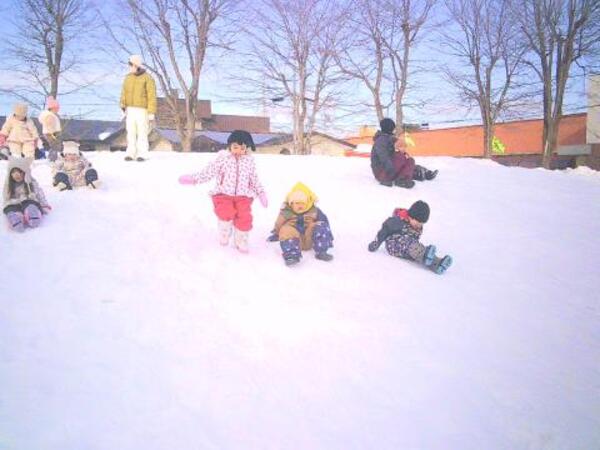 公園では肥料袋のソリに乗って、お尻滑りをしています。