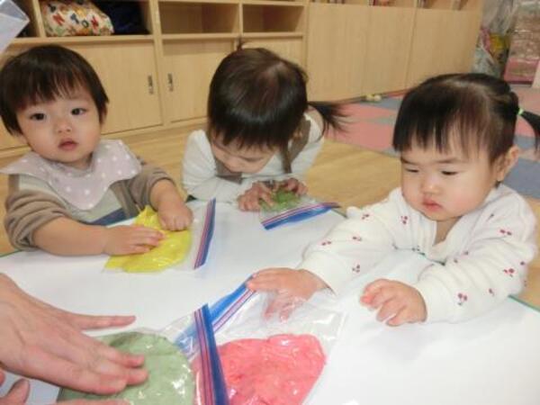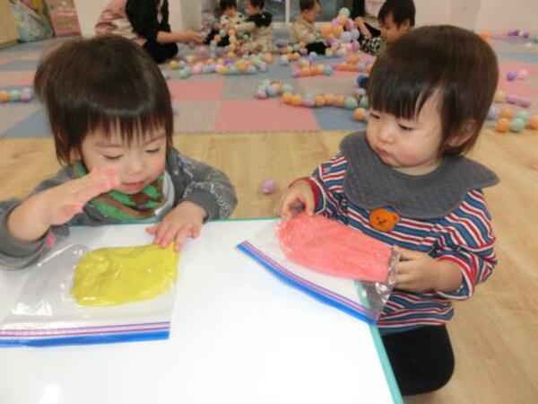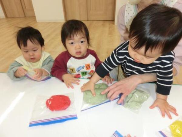 袋に入った小麦粉粘土を両手で握るように触ったり、指で押しては粘土の感触を楽しみ皆夢中になっていました。
