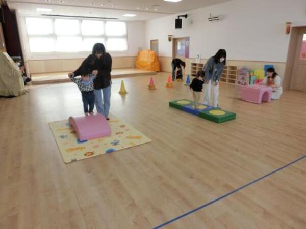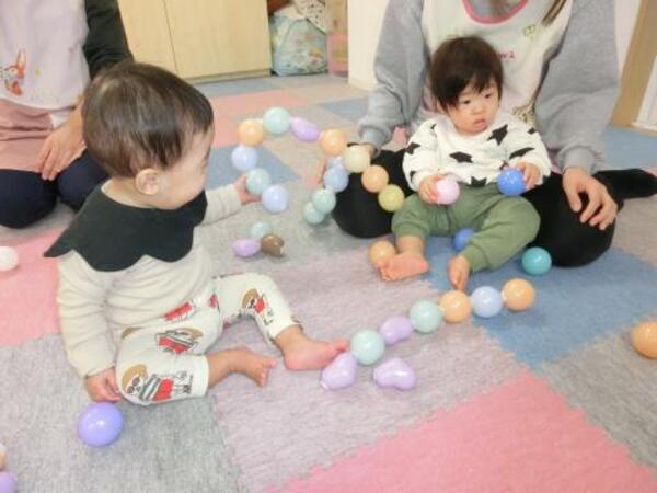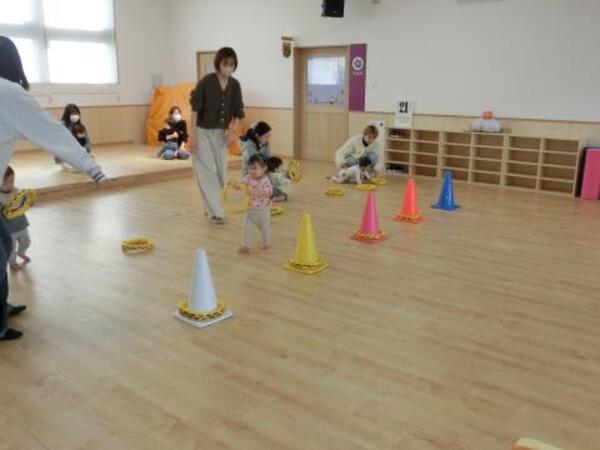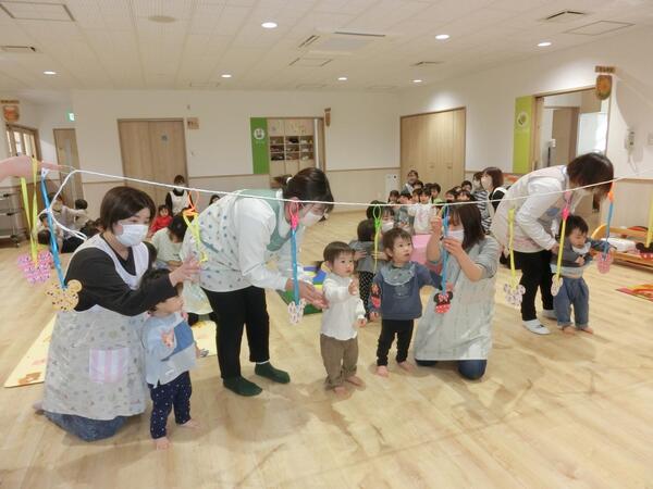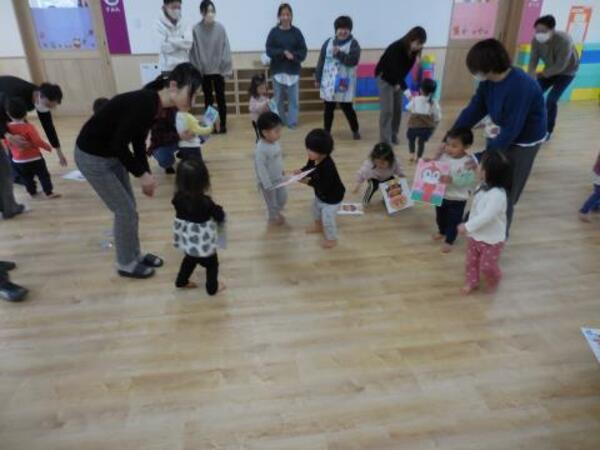 一緒に2階のホールへいって、触れ合い遊びやゲームをして過ごしました。