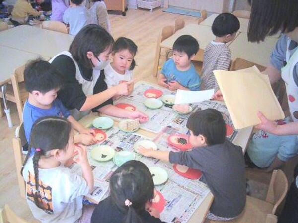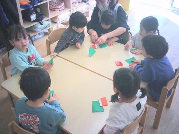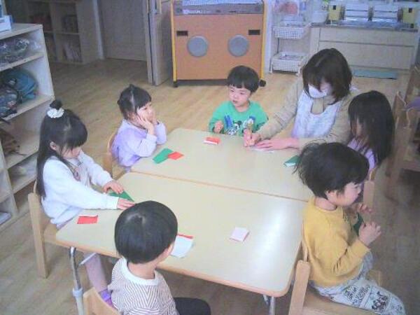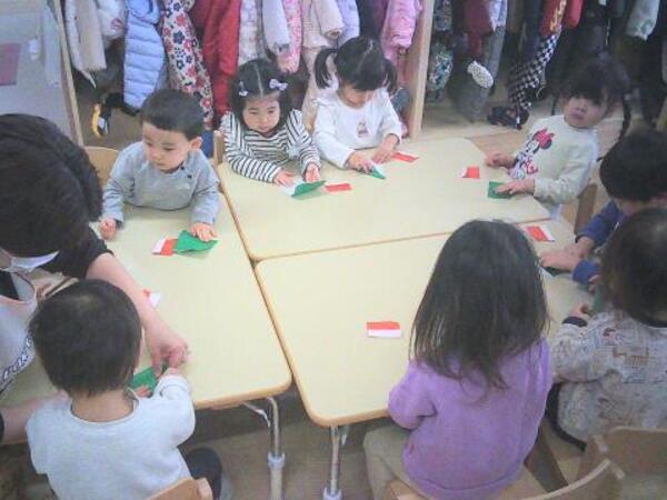 折り紙で獅子舞の顔と体を折ったり、だるまさんの顔に目やおひげを糊で貼ったりしています。