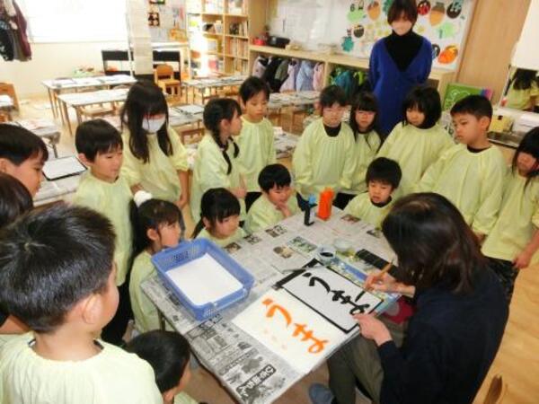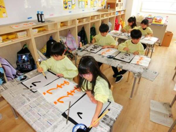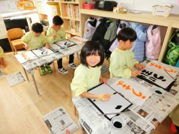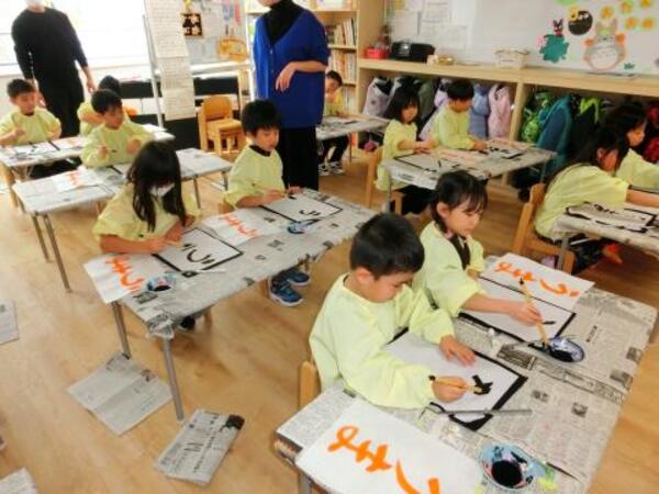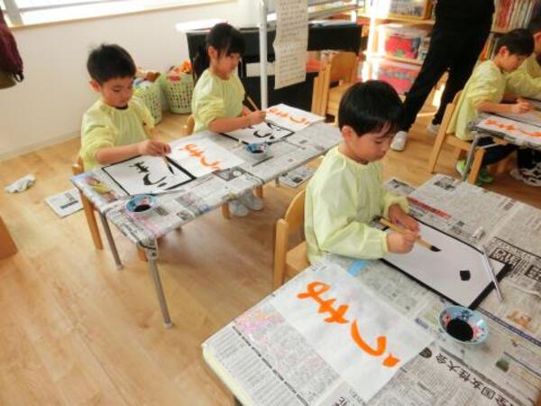 今日のすみれぐみは新年初めての習字で、午年の「うま」という文字を書きました。