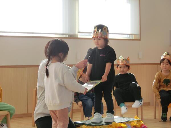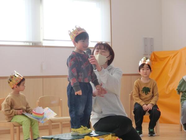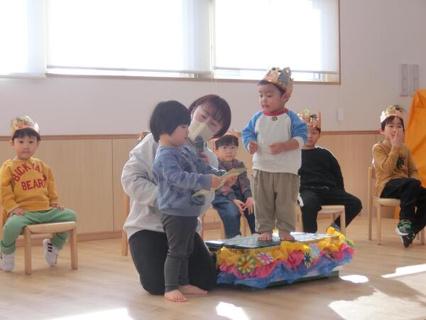 1月生まれのお友だちと11月生まれでお誕生会をお休みしていたお友だちのお祝いをしています。