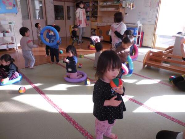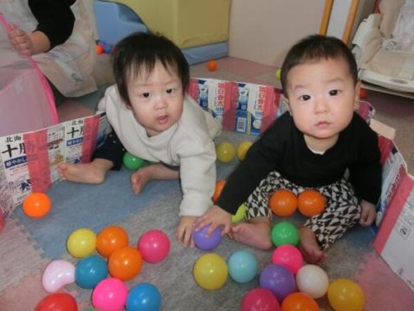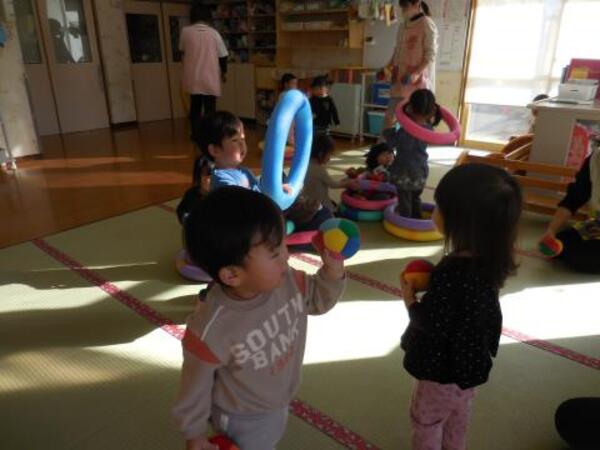 今日のつくしぐみは、布製のボールやプールスティックを使って遊んでいます。