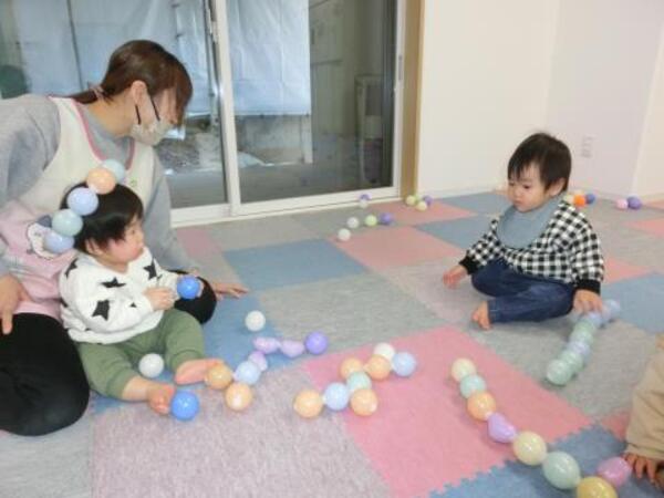 今日のひよこぐみは、お部屋でマジックテープボールと小麦粉粘土で遊びました。