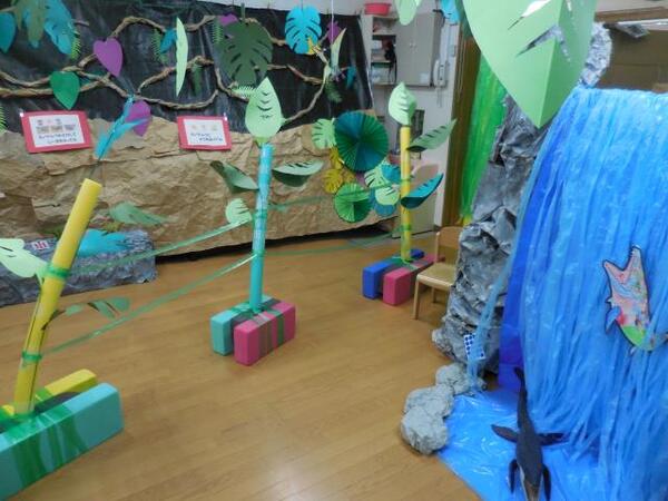 | 10月9日(木) さくらぐみは恐竜の世界『ジュラシックワールド』。 すみれぐみは『縁日』を行います。 時間をかけてみんなで作り上げたお店は、見ているだけで楽しそうです。 子ども達の楽しそうな表情が今から目に浮かびます。 |