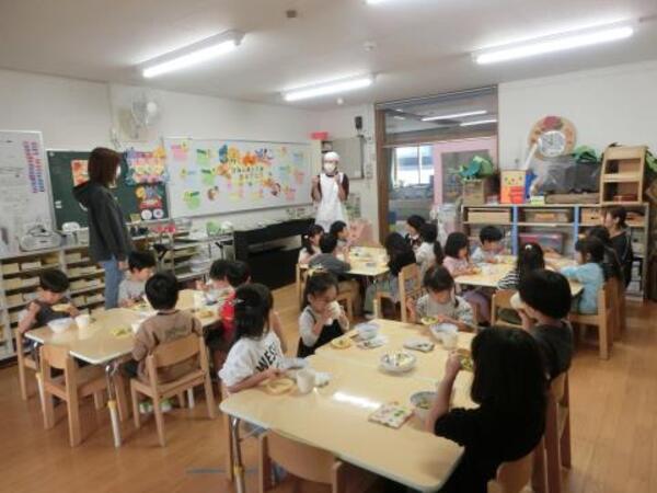 給食についての質問をしたり、美味しい給食を作ってくれていることの感謝を伝えたりしています。