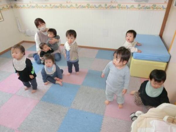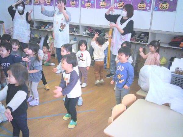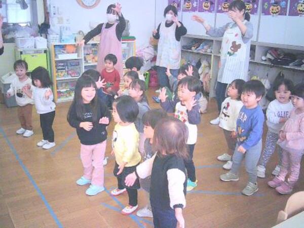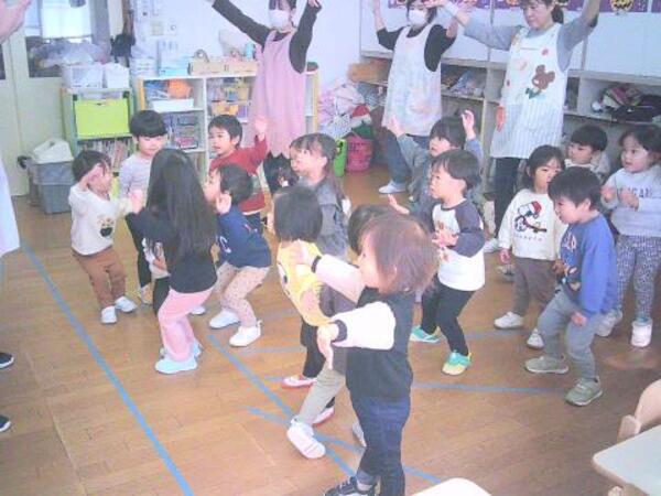 今日のひよこぐみは、お部屋でお遊戯会の練習をして、みんなで遊戯を踊っています。