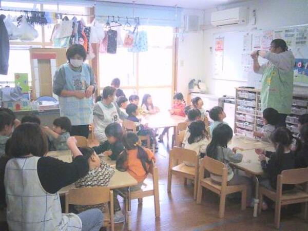 今日はさくらぐみに、給食室から調理師さんが見学にきました。