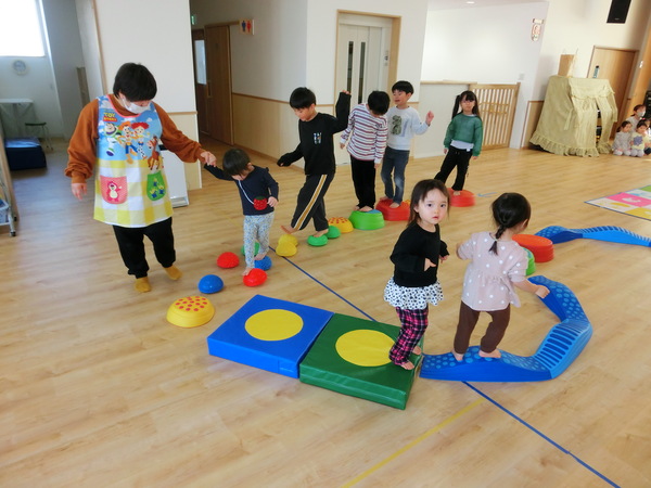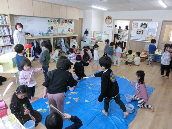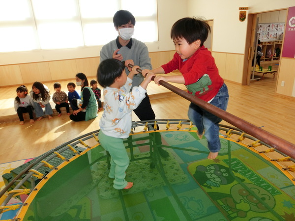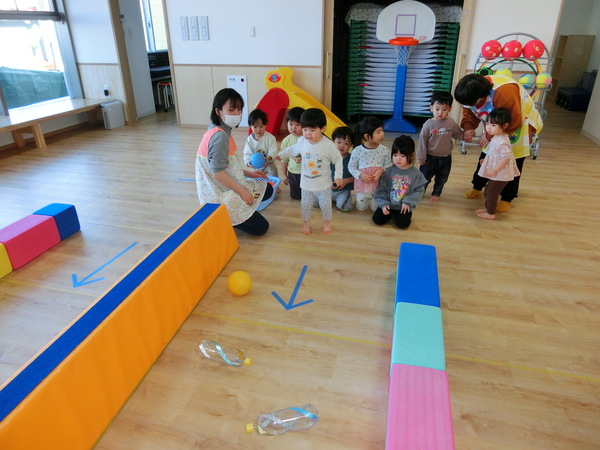 2月10日(火) すみれぐみのお部屋では、ゲ―ムコーナ−として「魚釣り」や「金魚すくい」「わにわにぱにっく」 ホ−ルでは、「トランポリン」「サーキット」「ボーリング」で沢山体を動かして遊びました。 |