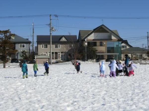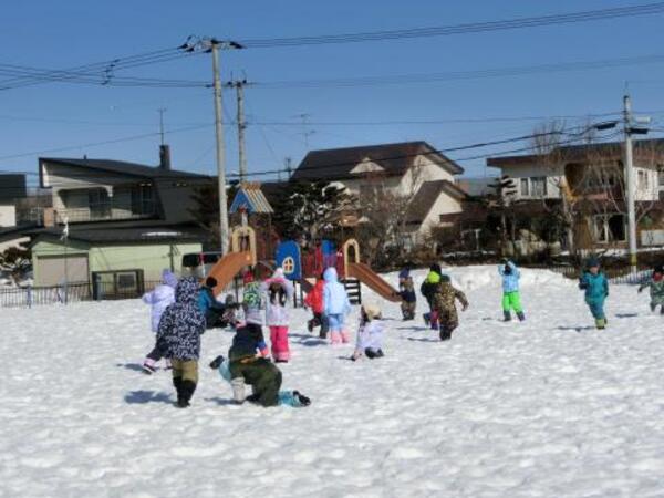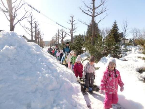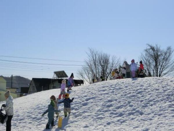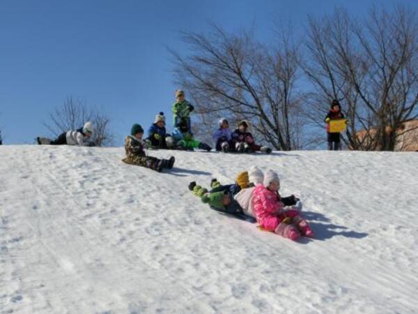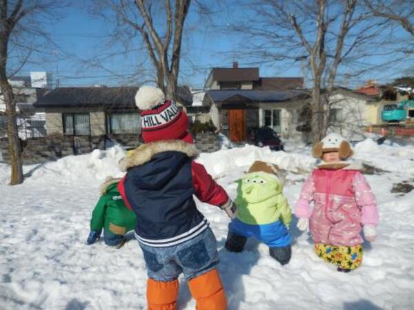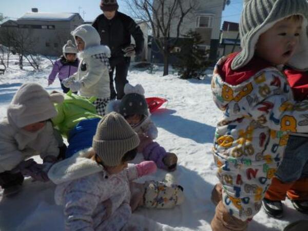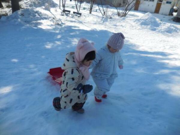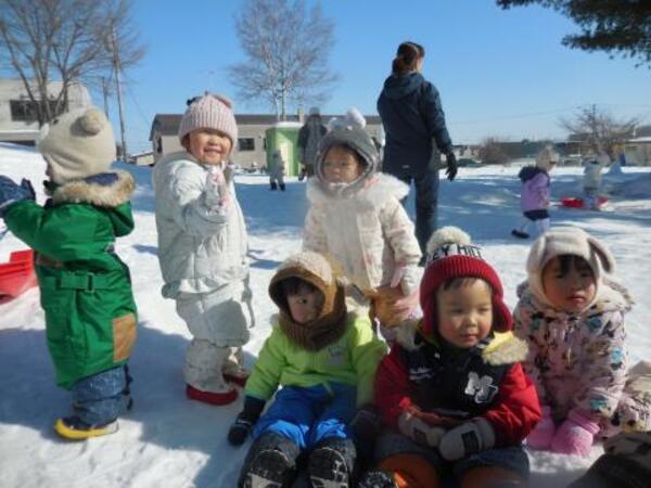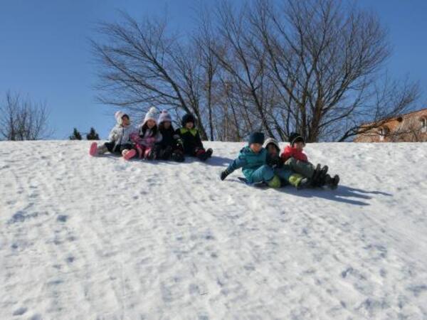 そり滑りをお友達や先生と一緒にしたり、雪の穴を発見して中に入ってみたり、雪玉や雪の固まりを見つけて喜んだりと、それぞれ楽しんで遊んでいた子ども達です。