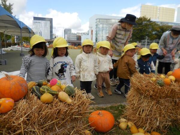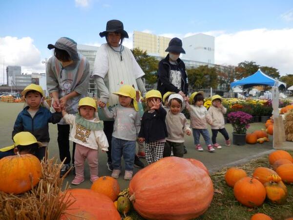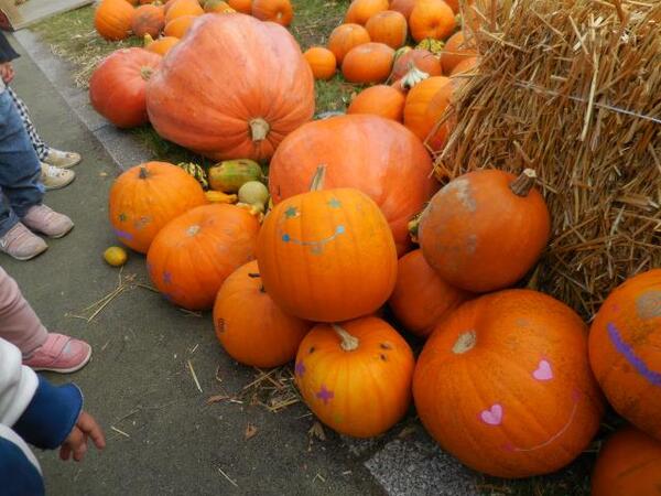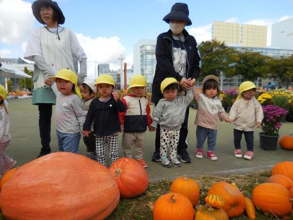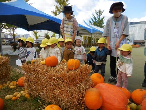駅前のお花を「きれいだね」と言って見たり、芸文前の形や色等の様々なカボチャに大喜びで触ったりしています。