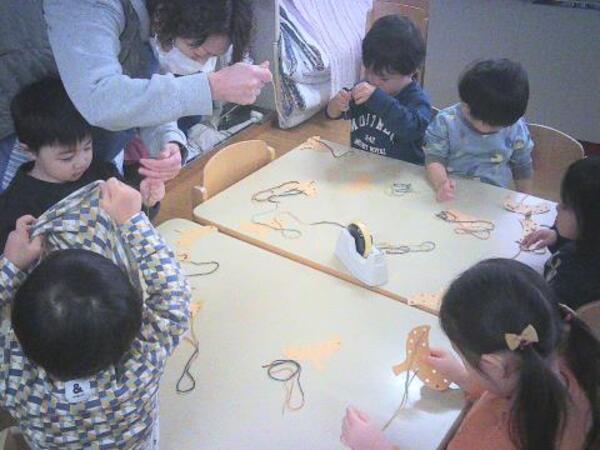 子ども達の好きな遊びの1つ「ひも通し」を取り入れ、どんぐりの帽子部分に開けた穴を自由に通し、できた模様を楽しんでいます。