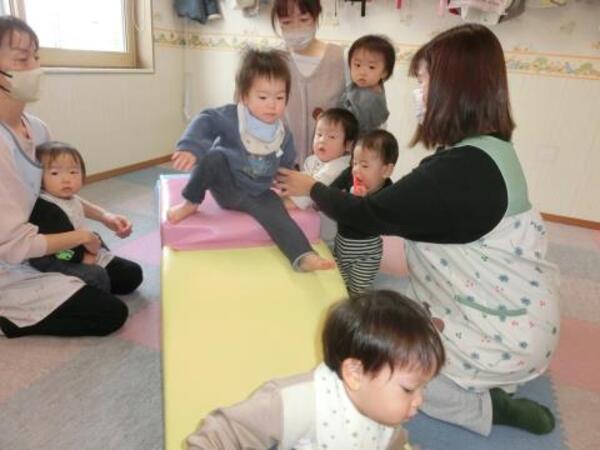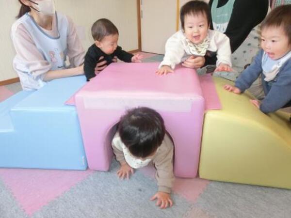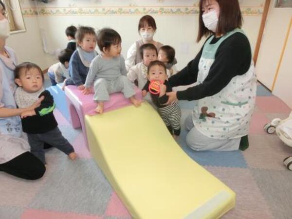 練習後はソフト巧技台で遊び、ハイハイで階段を上がったり、お尻滑りも楽しんでいます。