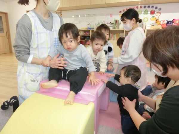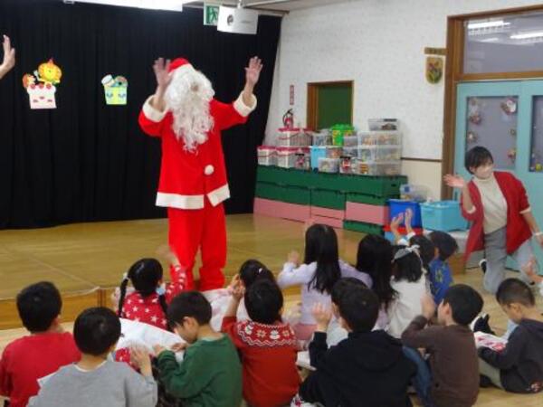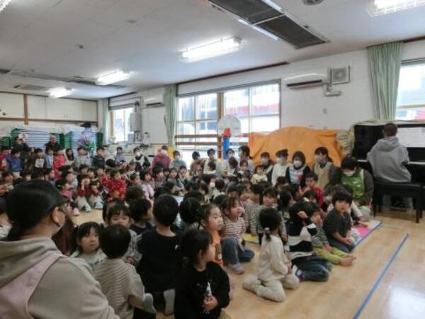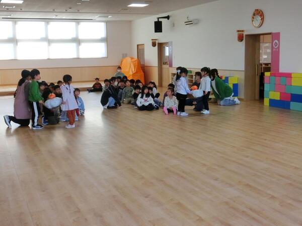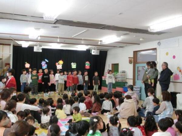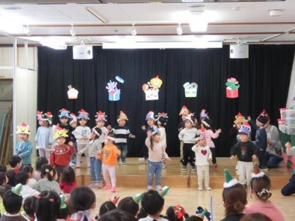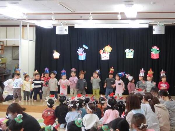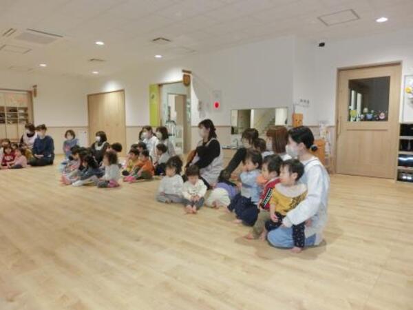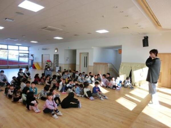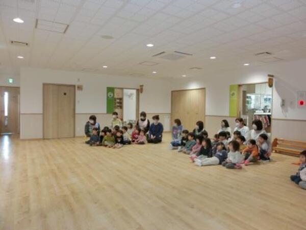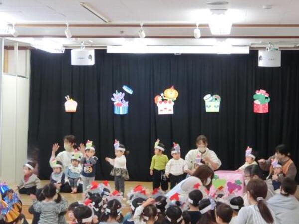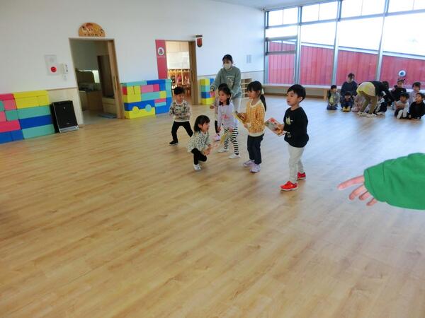 今日のちゅうりっぷ・さくら・すみれぐみは、2回のホールで新年お楽しみ会を行いました。
