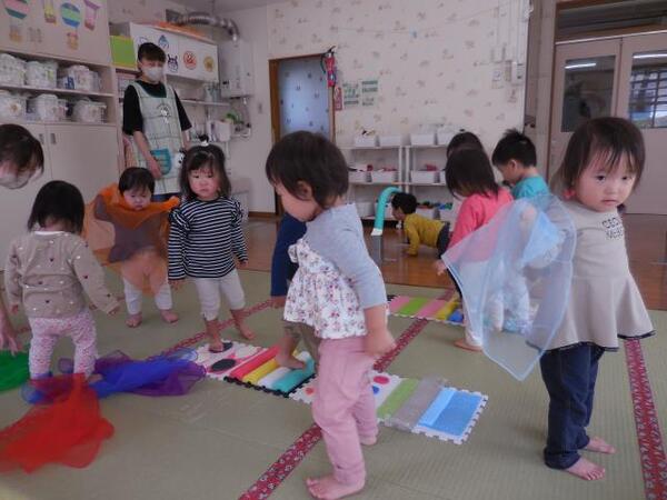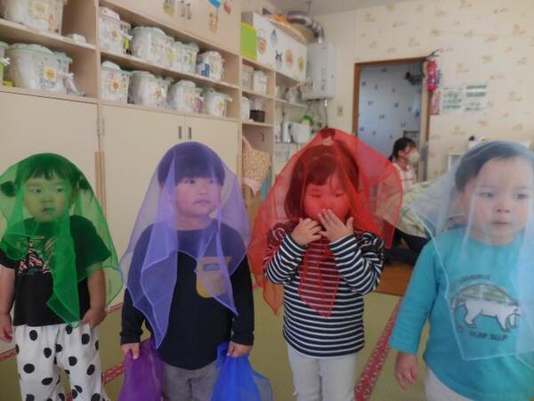 色やヒラヒラ・フワフワする感触に大喜びで、握りしめたり上から落としたり、頭の上に乗せたりして、それぞれ遊んで楽しんでいたつくしさんです。 |