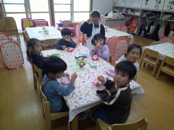すみれぐみのお部屋には『レストラン』があり、可愛いウエイトレスさんが美味しそうなお菓子を運んでくれていました。
