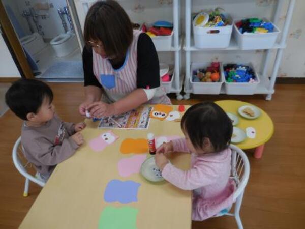 ふくろうも好きな2色を選んで目のシール貼りをしています。