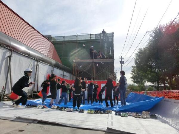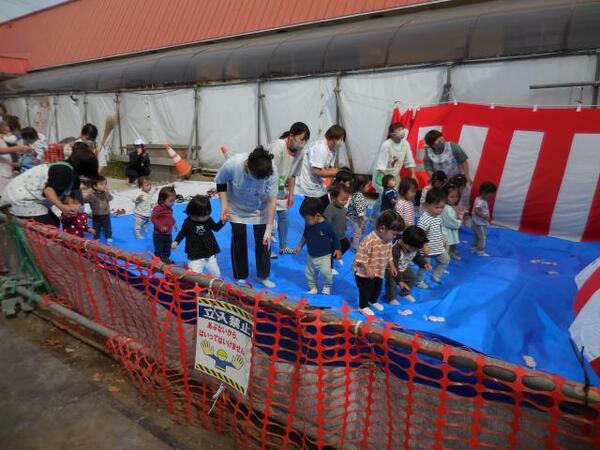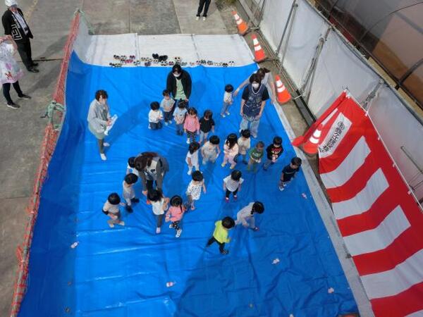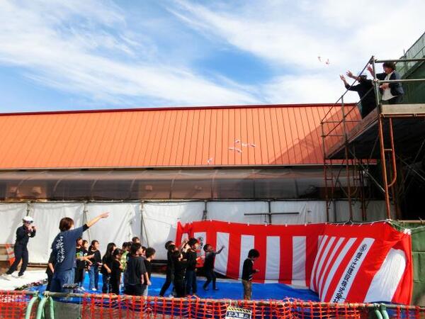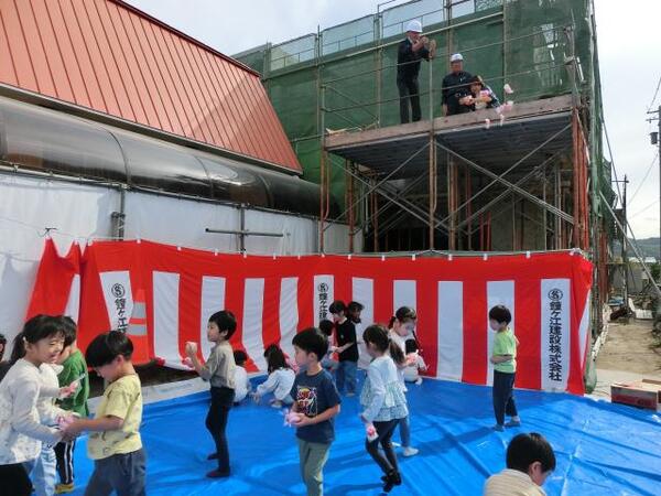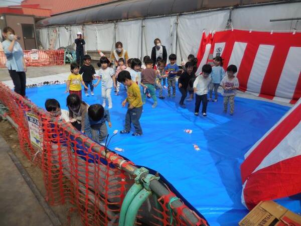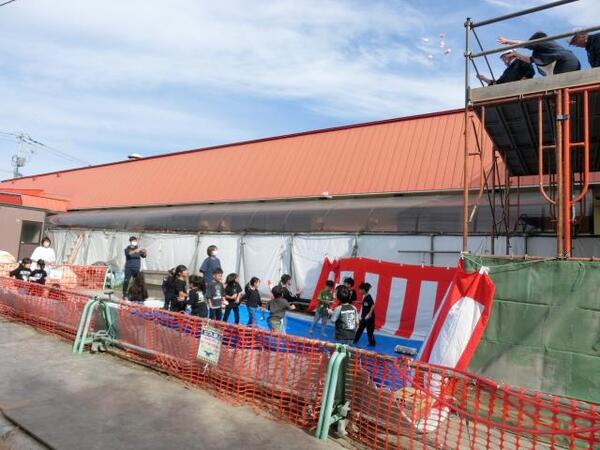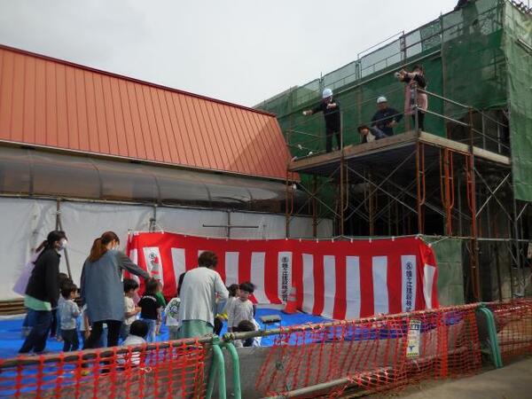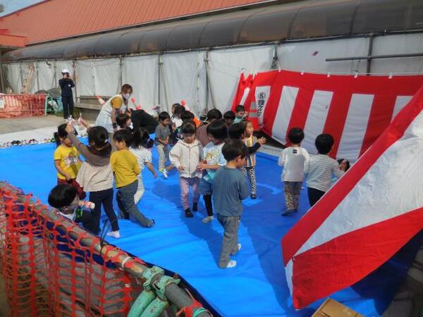 | 10月1日(水) 上棟式のさくらぐみ、すみれぐみの様子です。 上からまいてもらった餅を大喜びで拾っていた子ども達。 たくさん拾えて嬉しそうでしたよ! 新園舎の完成が今から楽しみです。 |