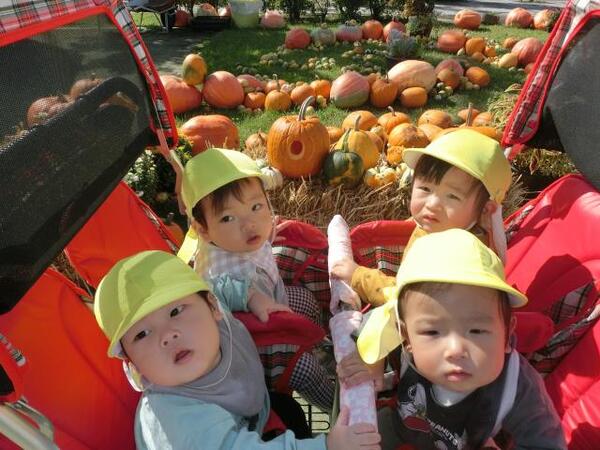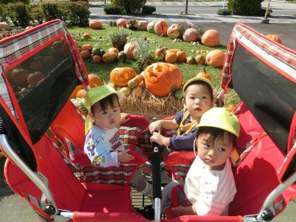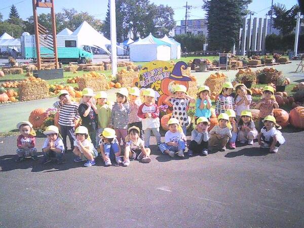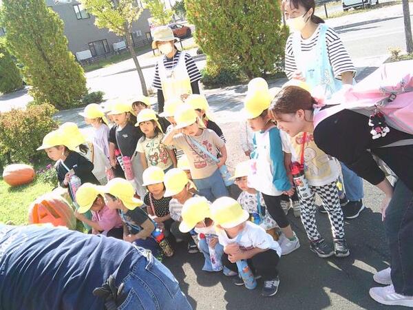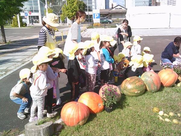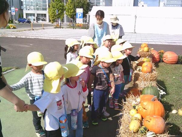 | 10月2日(木) 今日のちゅうりっぷぐみは、芸文方面にお散歩に行っています。 明日からはじまるお祭りの準備をしている所を見せて頂き、沢山のカボチャや駅前のお花を見て大興奮でしたよ! カボチャに文字を彫っている所も見せてもらい、「すごーい!」と貴重な体験ができました!! お祭りは明日から始まるみたいなので、ぜひ行ってみて下さいね! |