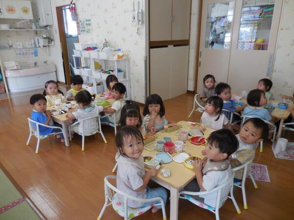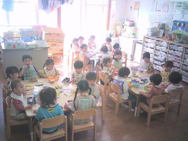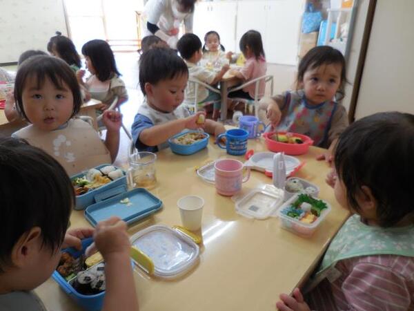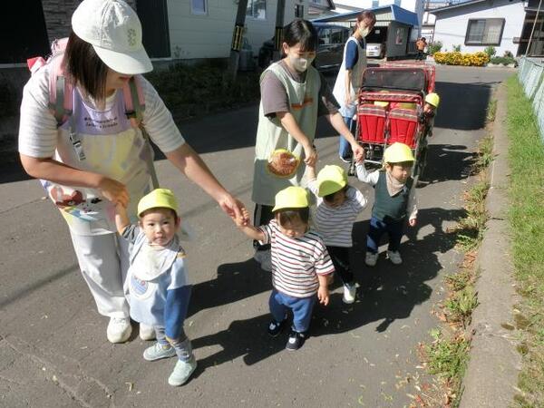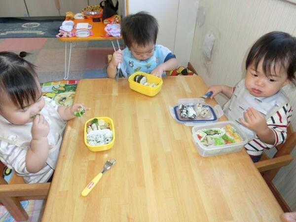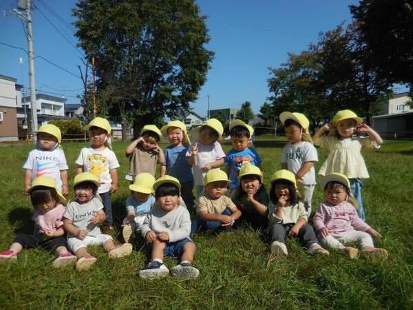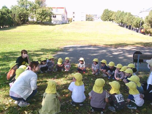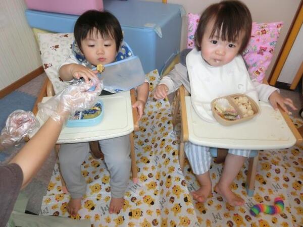 | 10月3日(金) 今日のひよこぐみは、園外保育でなかよし公園に行きました。 園から近い為、高月齢児は先生と手を繋いで、なかよし公園まで頑張って歩きました! 公園では歩ける子はみんな靴を履いて、歩く事を楽しみながら、周囲のまつぼっくりや落ち葉に触れて、秋の自然を感じています。 お弁当や給食(離乳食)も喜んで食べていたひよこぐみさんです。 |
