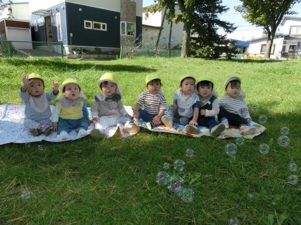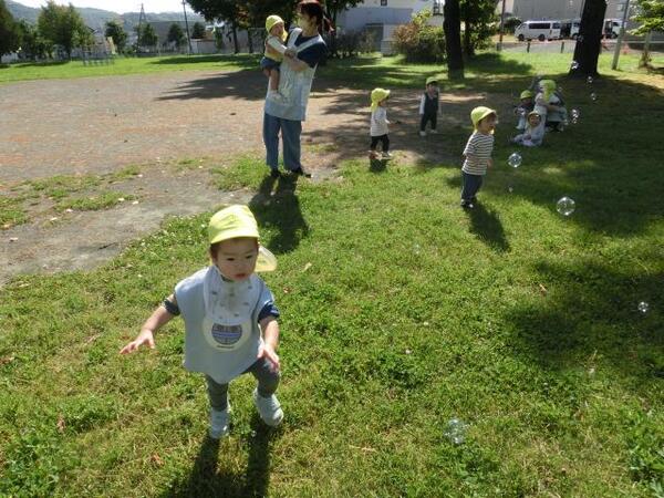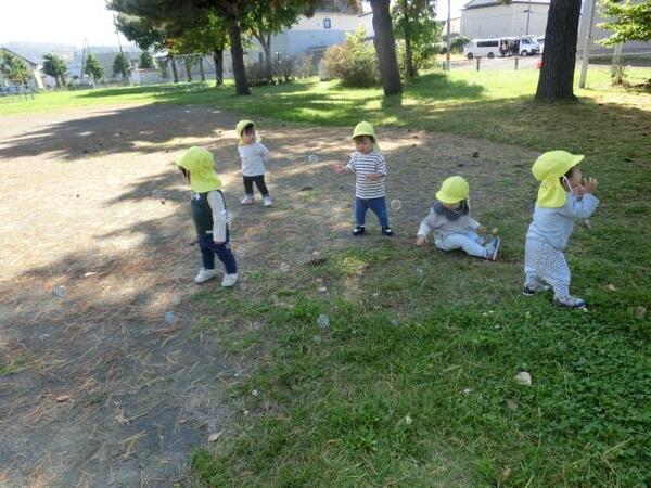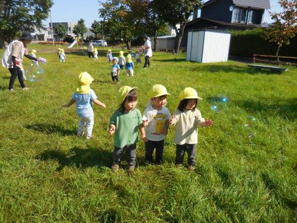 | 10月3日(金) 今日のつくしぐみは、泉第一公園へ遊びに行って来ました。 とてもいい天気で暑いくらいの気温でしたが、子ども達は元気いっぱい。 しゃぼん玉遊びやヨーイドンをして、公園の広場で遊んで来ましたよ。 大・中・小の様々なしゃぼん玉を追いかけて大喜びの子ども達。 ひたすらパーンパーンと手で叩いて割って楽しんでいましたよ。 ヨーイドンもくり返し行い沢山走っています。 体力もついてきて、走りまわって大喜びのつくしさんでした。 お弁当も喜んで食べていましたよ。 「おいしい!」とニコニコでした。 |