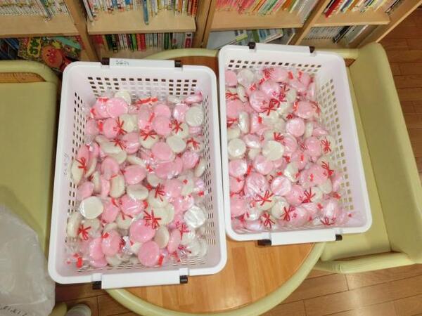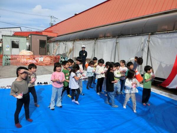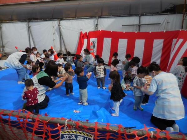| 10月1日(水) 今日は新園舎の上棟式(餅まき)をしています。 園長先生と設計事務所の社長さんが、お餅をまいてくれました。 初めての経験のお友だちが多かったのですが、お餅拾いをすることを聞くと嬉しそうに参加しています。 みんなお餅を手にもってニコニコ笑顔でしたよ。 |