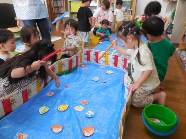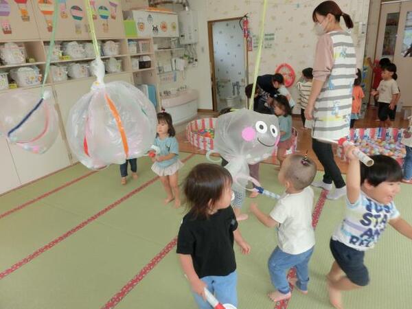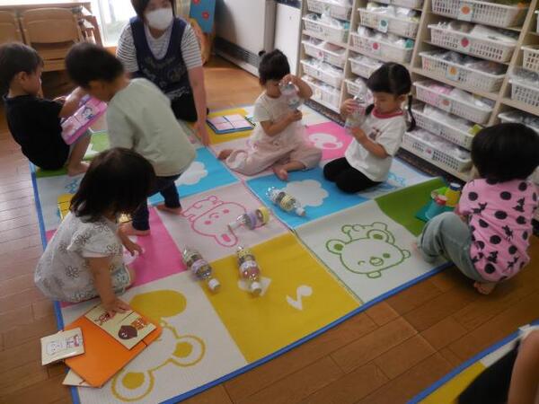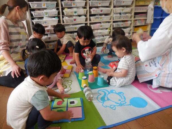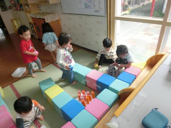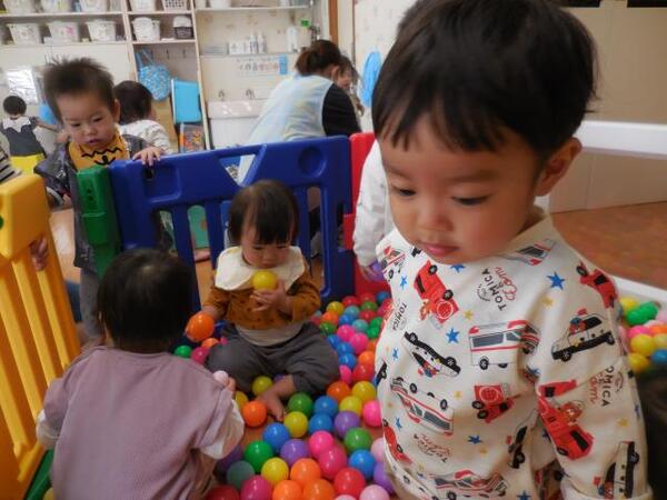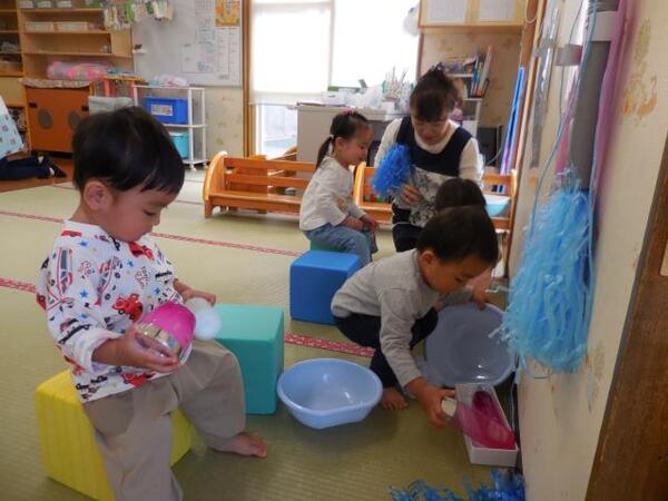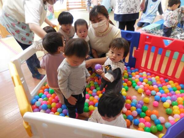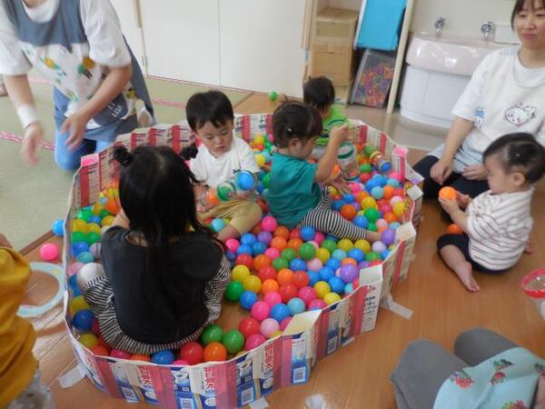 | 9月18日(木) 今日はにこにこタイムがありました。 ひよこ・つくし・たんぽぽさんのみんなで遊んでいます。 つくしぐみは体を動かすコーナーで、ポリ袋のポンポンスマッシュやボールプールやボーリング、他にもボール遊びのコーナーがたくさんあり、とても嬉しそうに遊んで目をキラキラとさせていましたよ。 たんぽぽには、センサリーバックやダンボールの玩具やペットボトルのビー玉コロコロや魚釣りをしています。 それぞれのコーナーでじっくりと遊んで楽しんでいましたよ。 子ども達同士の関わりも深まってきています! |