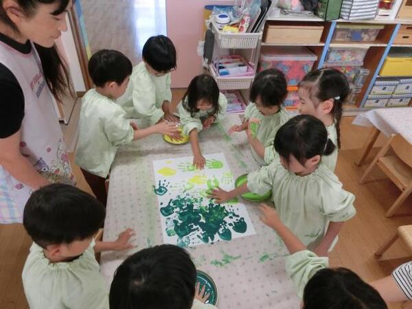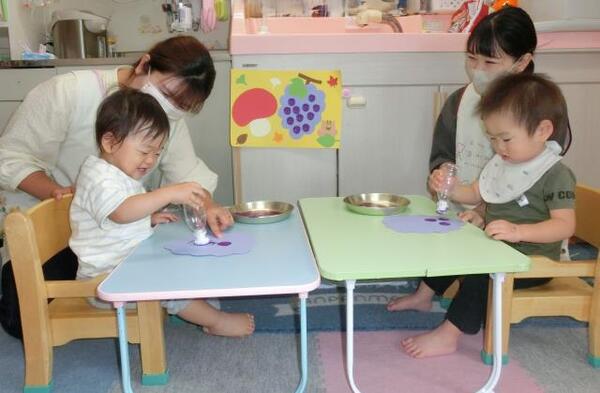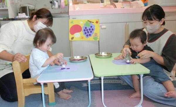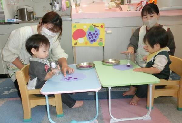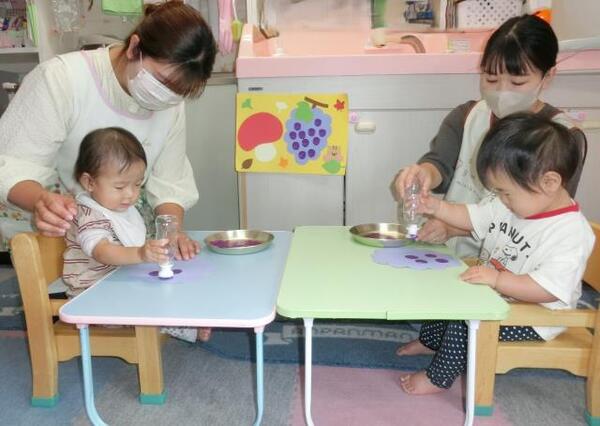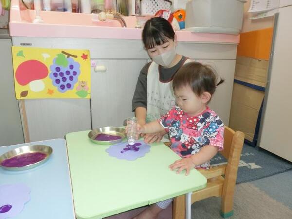 | 9月19日(金) 今日のひよこぐみは、9月の製作を行いました。 ぶどうの形の画用紙に、タンポでポンポンとスタンプを押して、ぶどうに模様をつけています。 前よりも握る力が強くなり、1〜2回先生とやると後は自分で好きなように押して、楽しむ姿が増えていて成長を感じましたよ! |