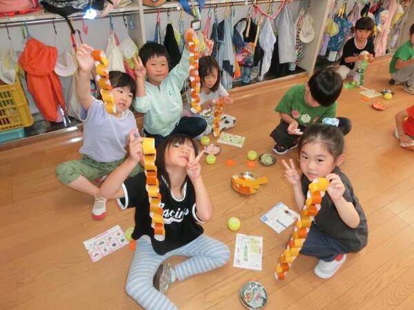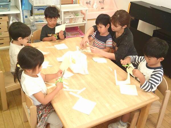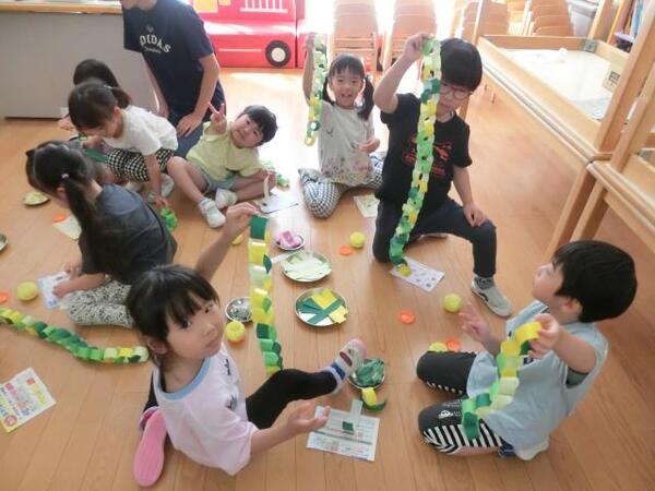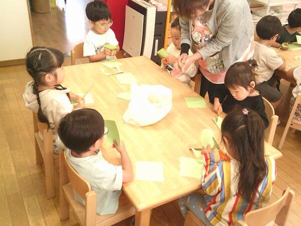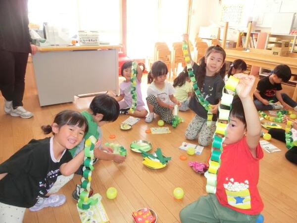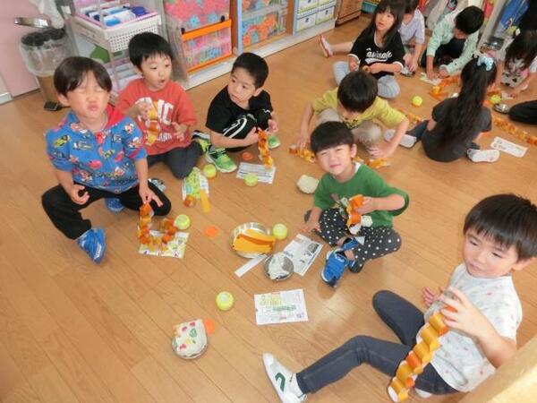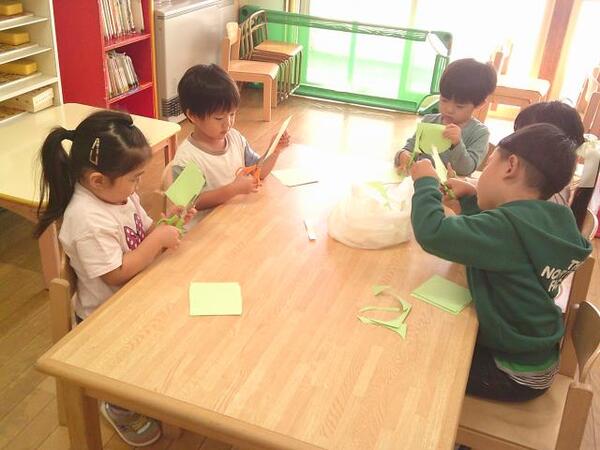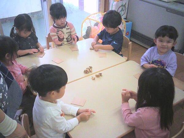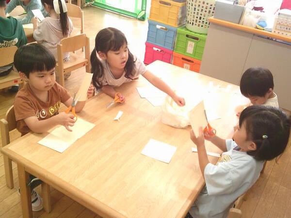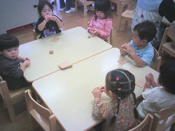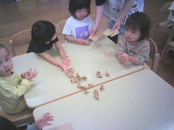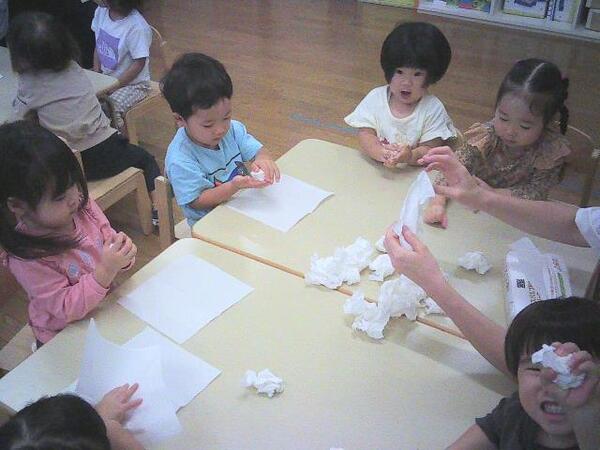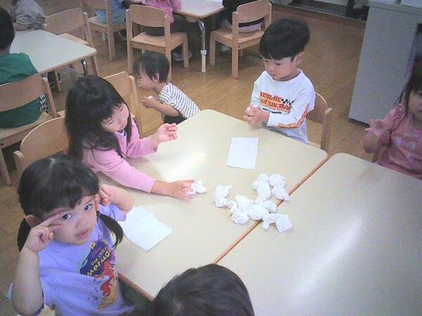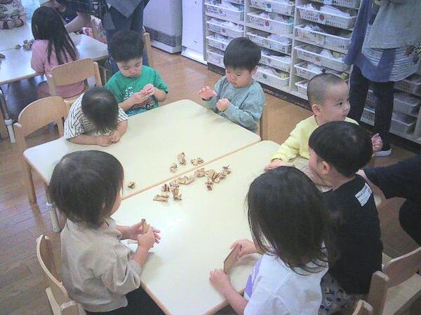 | 9月25日(木) 今日のたんぽぽぐみは、ごっこ遊びの製作を行っています。 たんぽぽ組が開店するのは『お寿司屋さん』!! ただ今、チビッ子寿司職人が開店準備に大忙しです。 キッチンペーパーでシャリを作ったり、茶封筒でいなり寿司の皮を作ったりと奮闘中!! 指先や手の平を沢山使って頑張っています。 |
