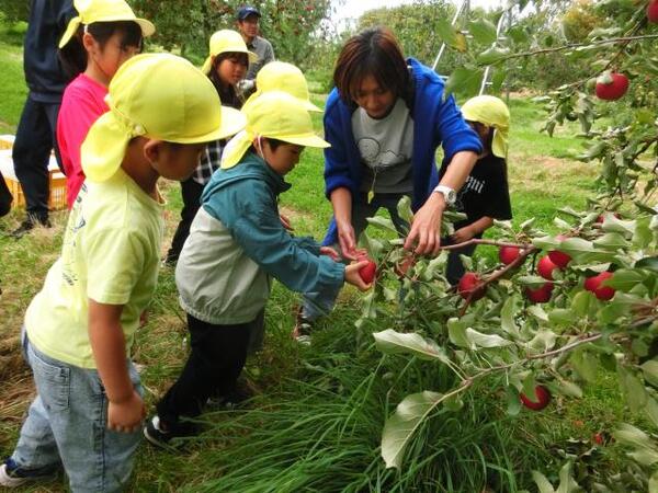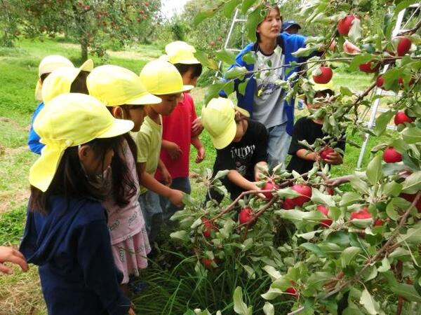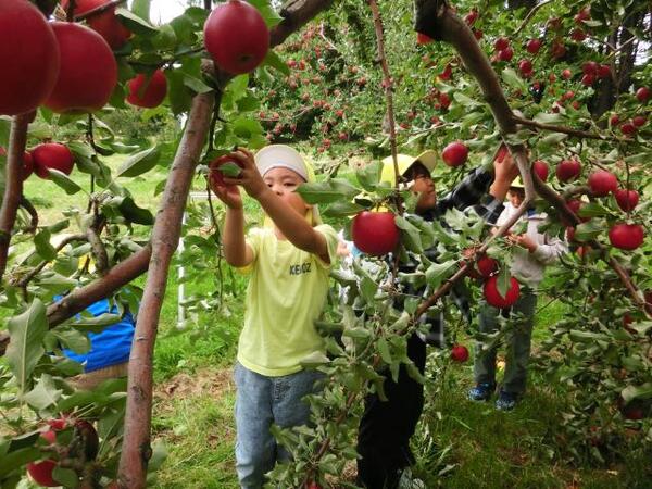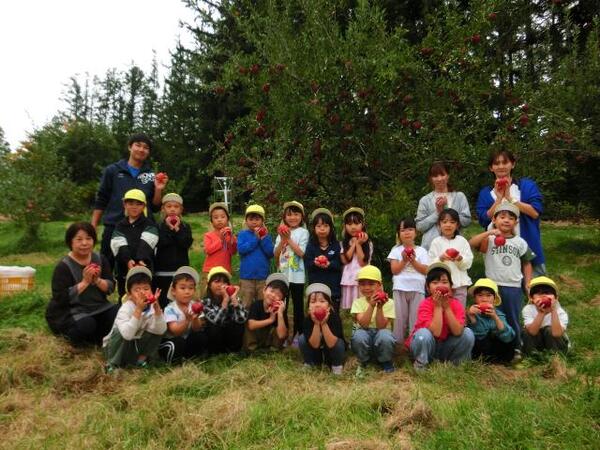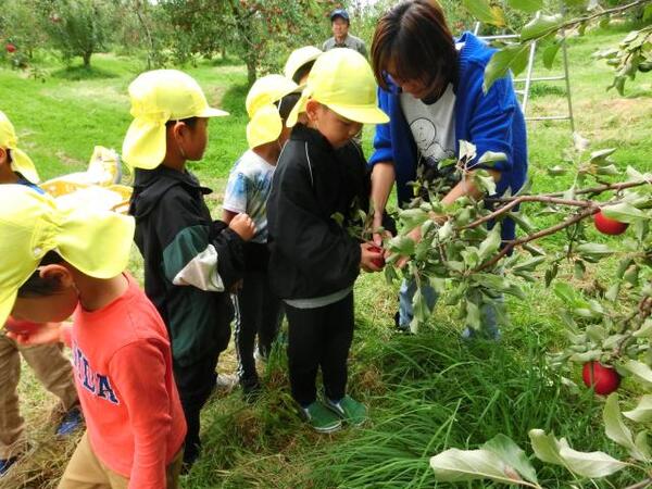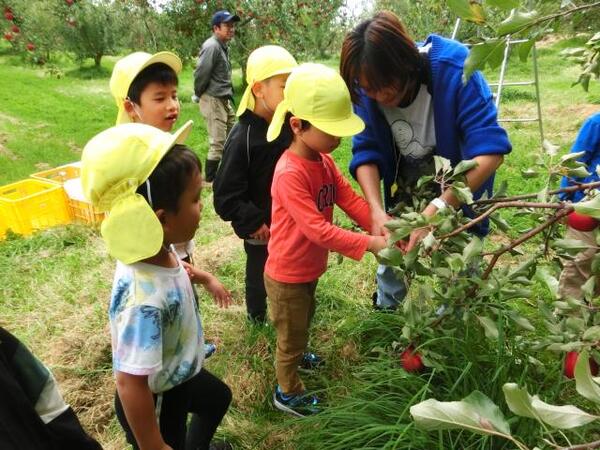 | 9月29日(月) 今日のすみれぐみは、りんご狩りに行ってきました。 バスに乗って果樹園につくと、まわりに実っているたくさんのりんごを見て、「りんごだ〜!」「すごーい!」と大喜びだった子ども達でした。 園長先生に取り方を教えてもらって、いざりんご狩りのスタートです。 |