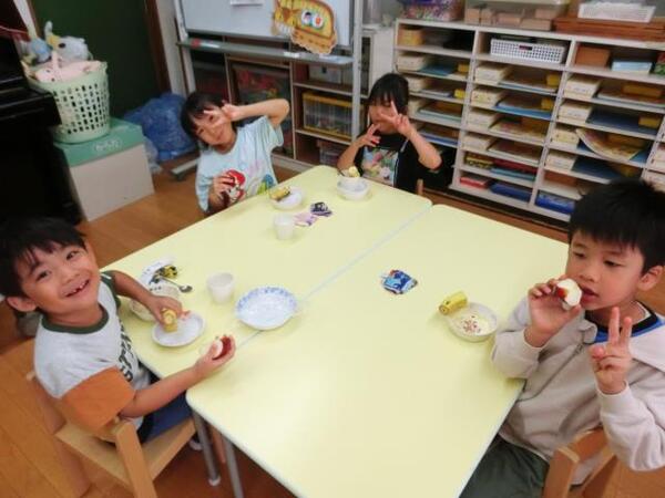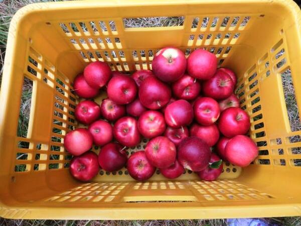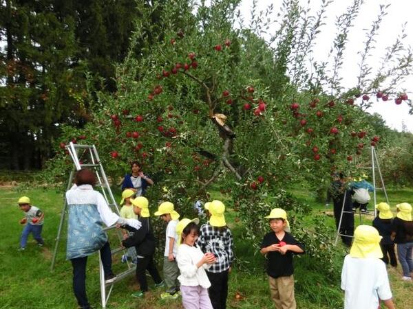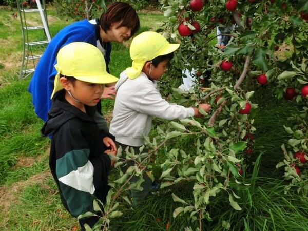 | 9月29日(月) 初めは上手くとれずに苦戦していた子も、たくさんとっているうちに、皆りんごをとるのが上手になっていましたよ! 木の高い所に実っているりんごまで全部取って、大喜びで帰ってきたすみれさんです。 今年は気温が高く豊作だったそうで、真っ赤なりんごがたくさんとれ、400個以上のりんごを園に持ち帰りました。 ひよこぐみ〜すみれぐみまでお土産として、お家に持ち帰ります。 残ったりんごは、給食のデザートとして出ますのでお楽しみに!! |