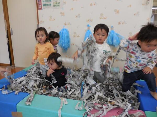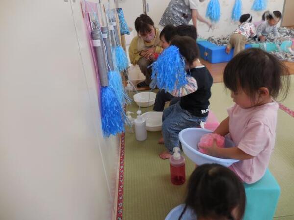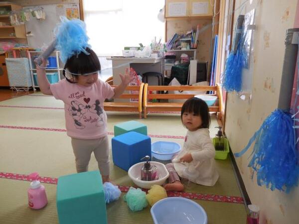 | 9月22日(月) 今日のつくしぐみは、初めてお風呂ごっこをしてみました。 ベビーサークルはボール風呂、カラー積み木で新聞紙風呂を作っています。 好きな所でのびのびと遊び大喜びでした。 特に新聞紙風呂が大盛り上がりで、ダイナミックに遊んで楽しんでいましたよ。 洗い場では丁寧に頭や体・顔を洗って楽しみ、お気に入りのボトルを持ち歩く子もいた程でした。 ひよこ組さんも誘って、みんなで仲良く遊び楽しんでいます。 |