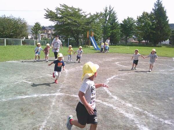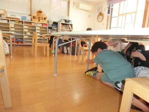 | 9月8日(月) 今日は地震時の避難訓練を行なっています。 地震を想定しているため、ベルの音を聞いてテーブルの下や安全な場所で身を守り、その後なかよし公園へ。 そこからまた高台への移動を想定して芸文前広場まで移動しています。 毎月避難訓練を行なっている為、ベルの音に驚くことなくみんなで上手に避難する事が出来ました。 |