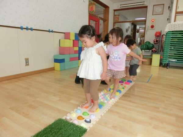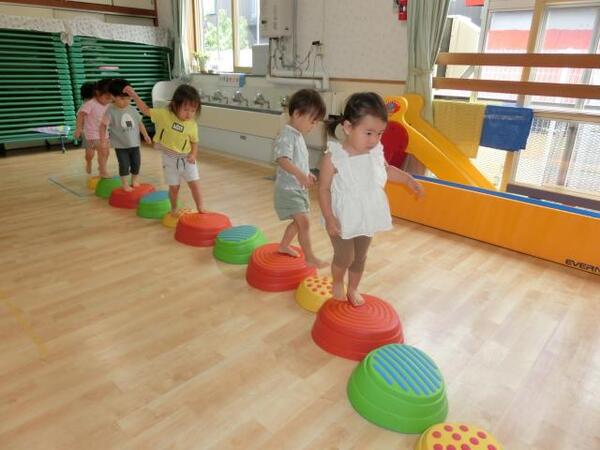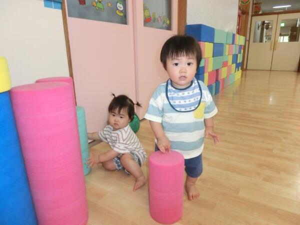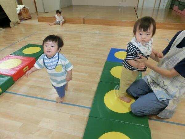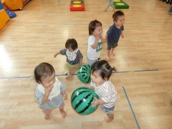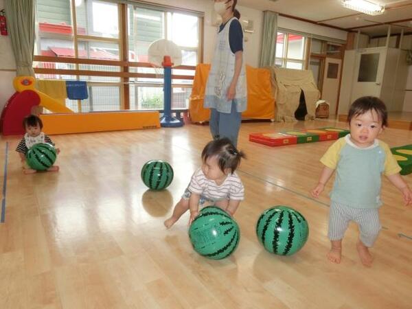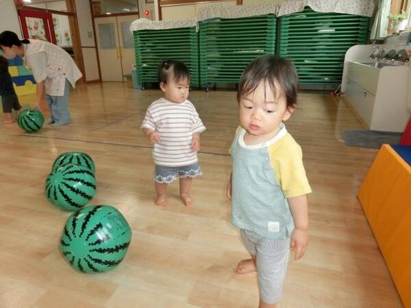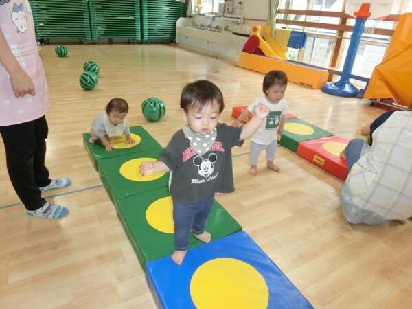 | 9月9日(火) 今日のひよこぐみは、ホールでJPクッションやスイカのビーチボールで遊んでいます。 先生と手を繋いでJPクッションの上を歩いたり、自分でハイハイで上がって思い思いに楽しんでいたひよこ組さんです! スイカのビーチボールを両手で持ち、転がしては追いかけ笑顔いっぱいでしたよ。 ビーチボールの柔らかい感触を楽しんでいました。 |
