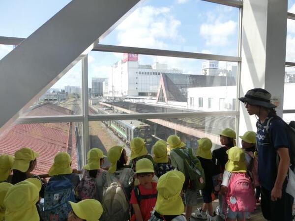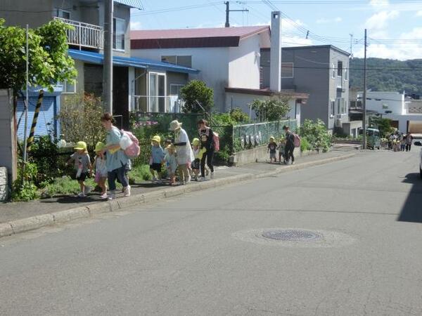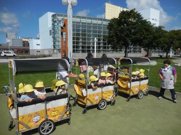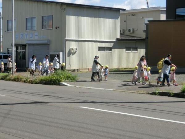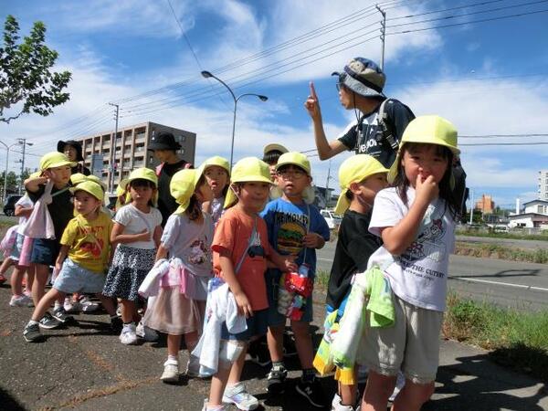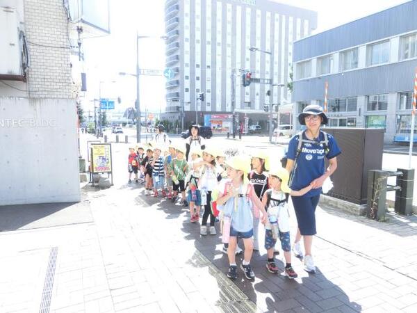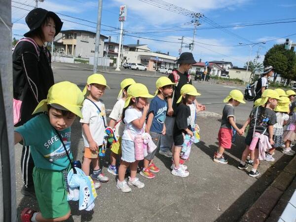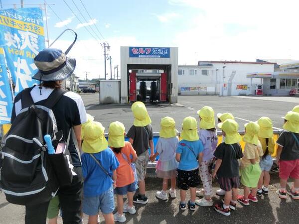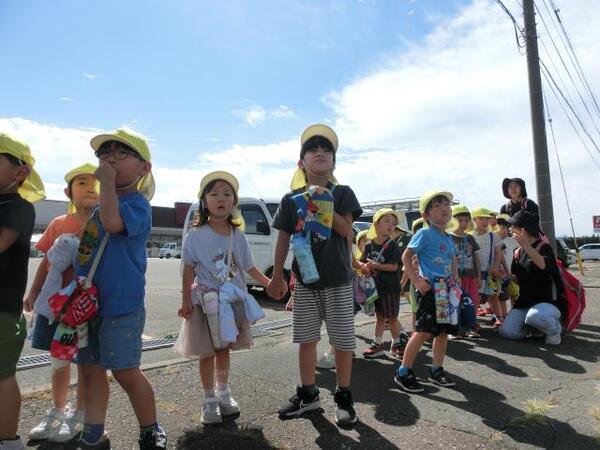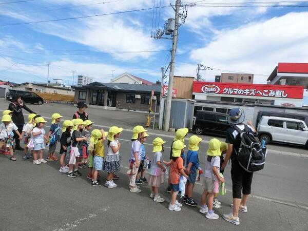 | 9月10日(水) 今日のさくらぐみは、久しぶりに街探検へ行ってきました。 今回は南大通り方面へ。 コインランドリーやアークス、ガソリンスタンド、美容室、コンビニなど見てきました。 洗車している様子は、特に興味津々でしたよ。 たくさん車が通る事、車に気を付けて歩く事を伝えていたので、列の間があかないように気を付けて歩いています。 帰りは桜町公園で水分補給と少し休憩をしてきました。 気温が高かったですが、元気に行ってきました。 |