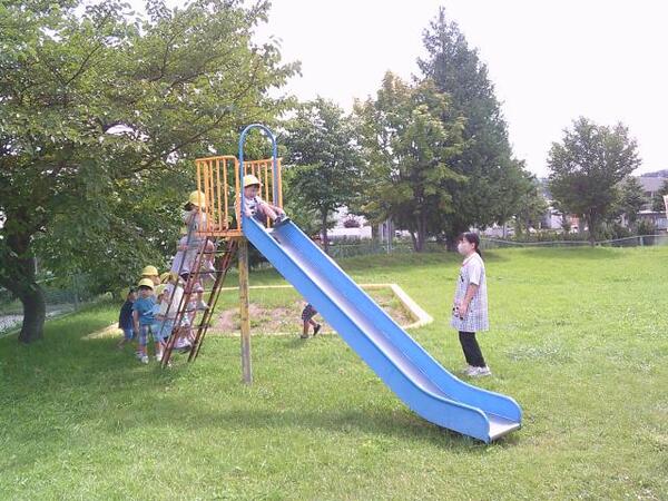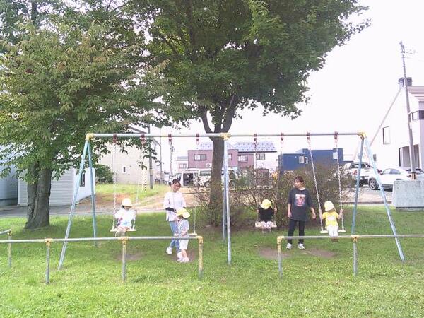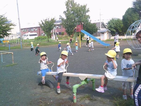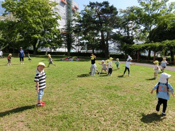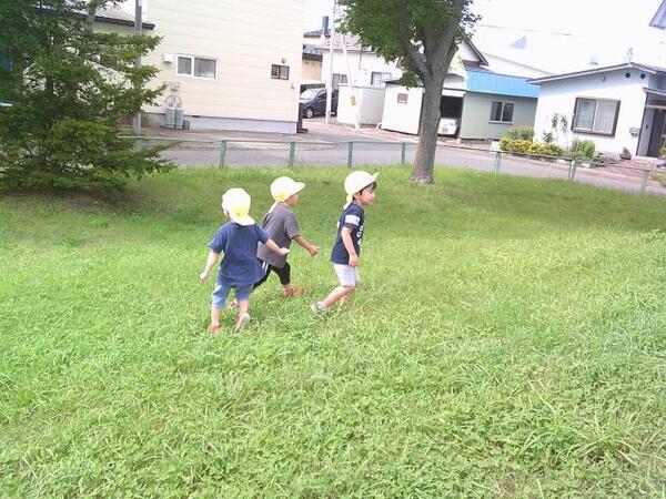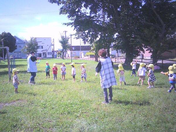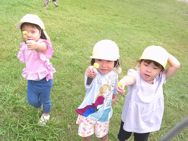 | 9月11日(木) 今日のちゅうりっぷぐみは、ごっこあそびで行うお店についての話し合いを行った後、なかよし公園で遊んでいます。 久しぶりに滑り台やブランコの遊具で遊んだり、お山を走ったり、たんぽぽやシロツメクサのお花を摘んだりと楽しんできましたよ!! みんなで増え鬼や手つなぎ鬼も行い、沢山体を動かして楽しみました! |