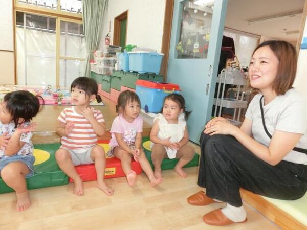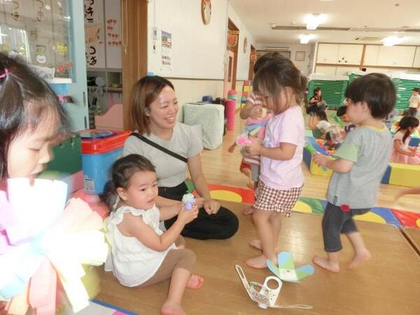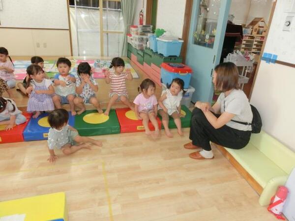 | 9月11日(木) 今日は地域支援の活動を行いました。 1組のお友だちとお母さんが遊びに来てくれましたよ。 たんぽぽぐみのお友だちと一緒にホール遊びをしています。 たくさん体を動かしてにこにこのお友だちでした。 また遊びに来てね! |