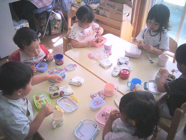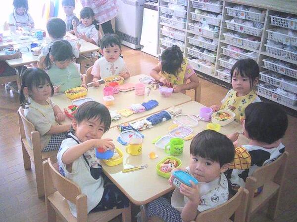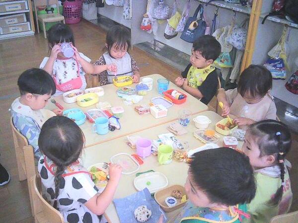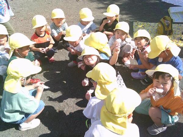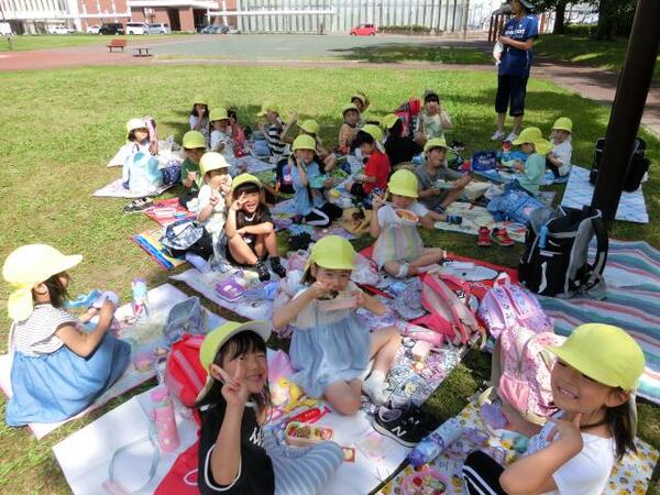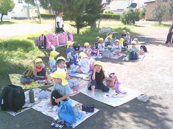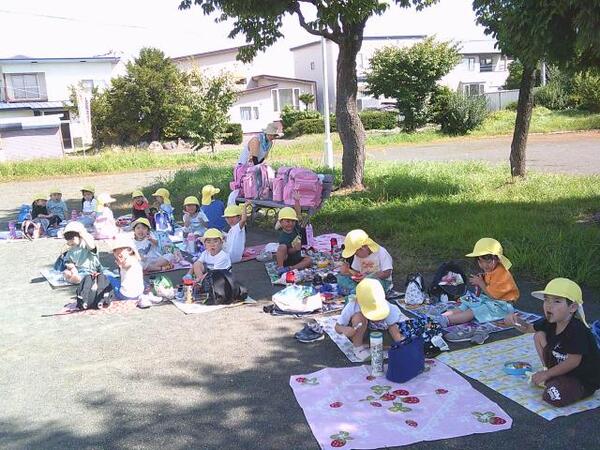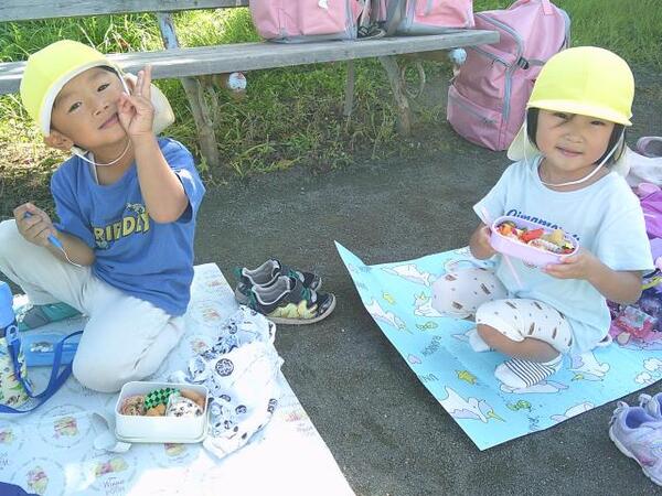 | 9月12日(金) 今日のたんぽぽぐみは、園外保育ということで、泉第一公園を目指して園を出発しました。 少〜し遠回りをしながら歩き、秋のお花やぶどうなどを見てきました。 公園では、先生達とのお約束をしっかり守り、すべり台やジャンプ台、しゃぼん玉などをして楽しく過ごしてきましたよ。 お部屋で楽しみにしていたお弁当を食べています。 みんなとっても嬉しそうでした!! |