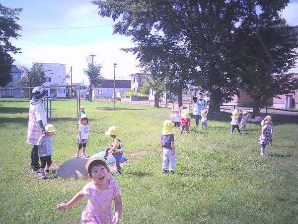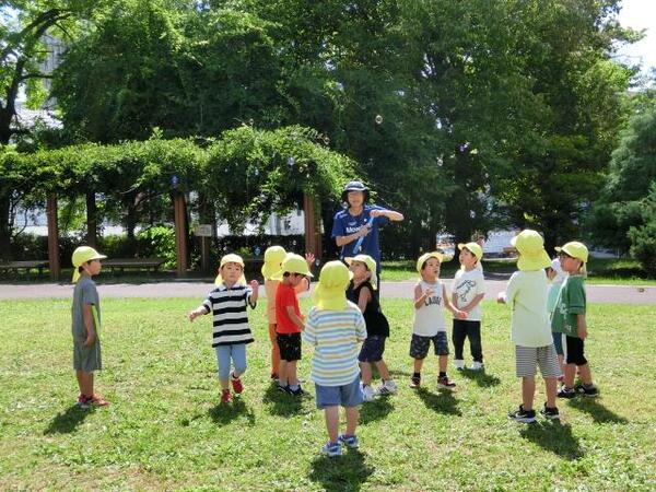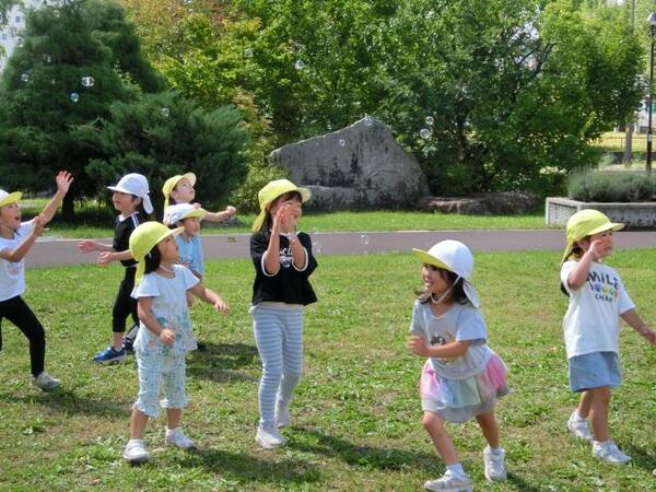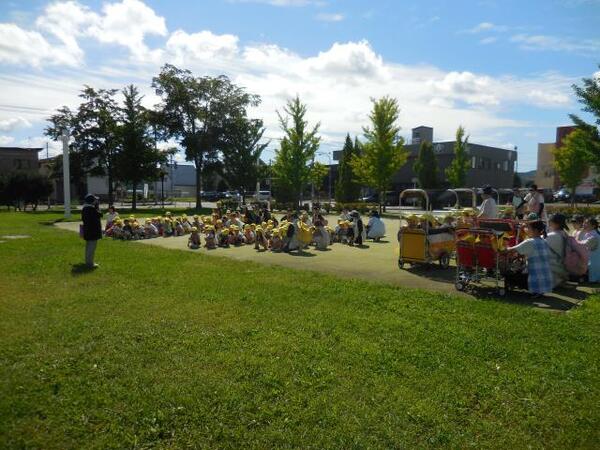 | 9月12日(金) 今日のちゅうりっぷぐみは、園外保育で白樺公園に行っています。 初めてお弁当を入れたリュックを背負って歩きました! 重たかったですが、一生懸命歩いていましたよ。 公園では遊具で遊んだり、久しぶりにしゃぼん玉も楽しみました。 たくさん遊んだ後は、お待ちかねのお弁当タイム♪ お弁当を見せ合いながら、喜んで食べていましたよ♡ ご用意ありがとうございました!! |