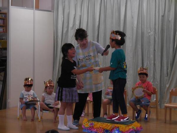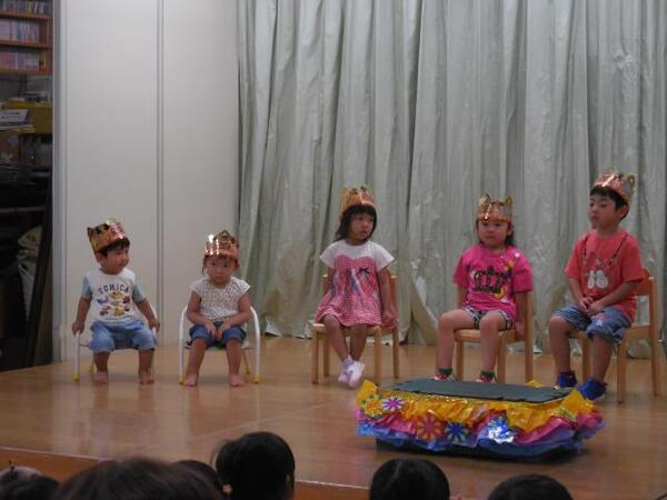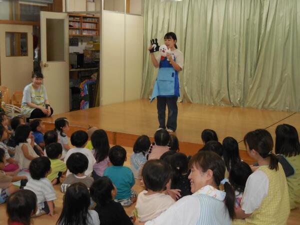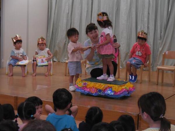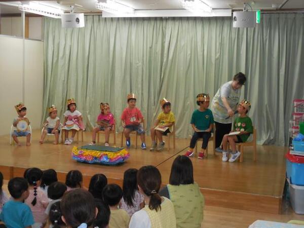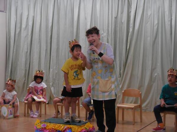 | 8月19日(火) 今日は8月生まれのお友だちのお誕生会を行いました。 先月お休みしていた7月生まれさんも、一緒にお祝いしています。 緊張しているお友だちが多かったようですが、カードや歌のプレゼントをもらい、皆ニコニコでしたよ! 今月の出し物は先生のエプロンシアターでした。 『くいしんぼうおばけ』と『おべんとうバス』を発表し、楽しそうに見ていた子ども達です。 お誕生日おめでとう!! |