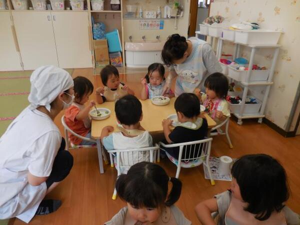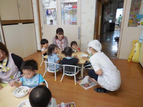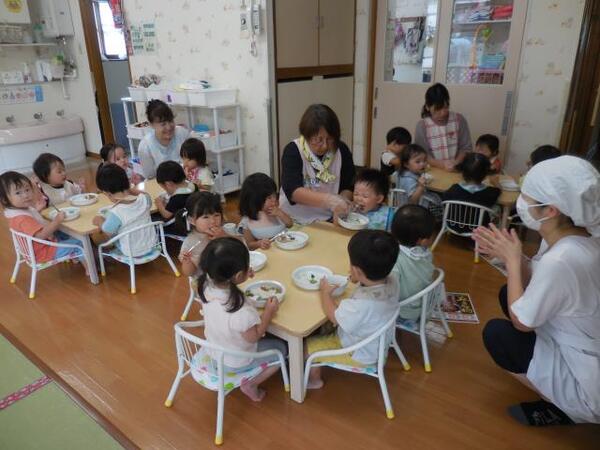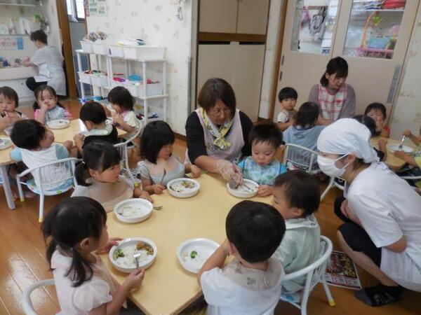 | 9月2日(火) 今日のつくしぐみは、お昼にいつも美味しい給食を作ってくれる先生が、見学に来てくれました。 お名前や好きな食べ物・得意な料理等を聞いたり、子ども達の食べる姿を見てもらい、たくさん食べる姿や上手にフォークで食べる姿に驚きや喜びを感じてもらえましたよ。 いつも作ってもらう事に感謝し、バイバイ〜と手を振ってニコニコなつくしさんでした。 |