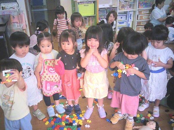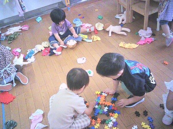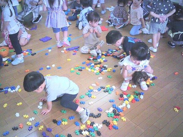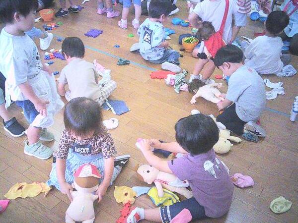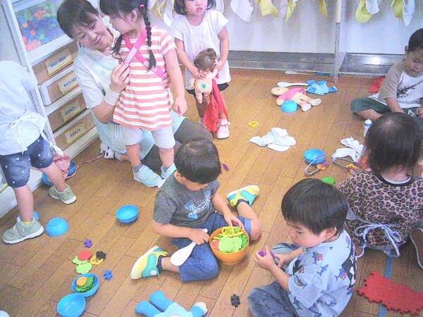 | 9月3日(水) 今日のたんぽぽぐみは、運動会の練習を室内でした後、赤ちゃんのお人形やブロックで遊びました。 エプロンを付けて赤ちゃんのお世話をしたり、ブロックをたくさん繋げて線路を作ったり。 りんごやぶどう等好きな物を作り、楽しんでいましたよ! |